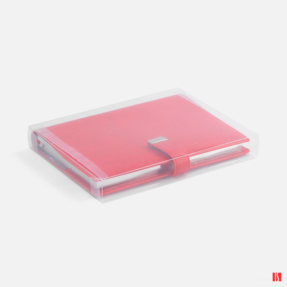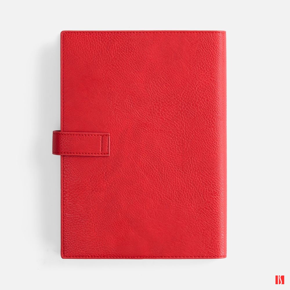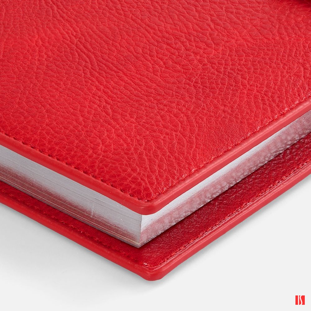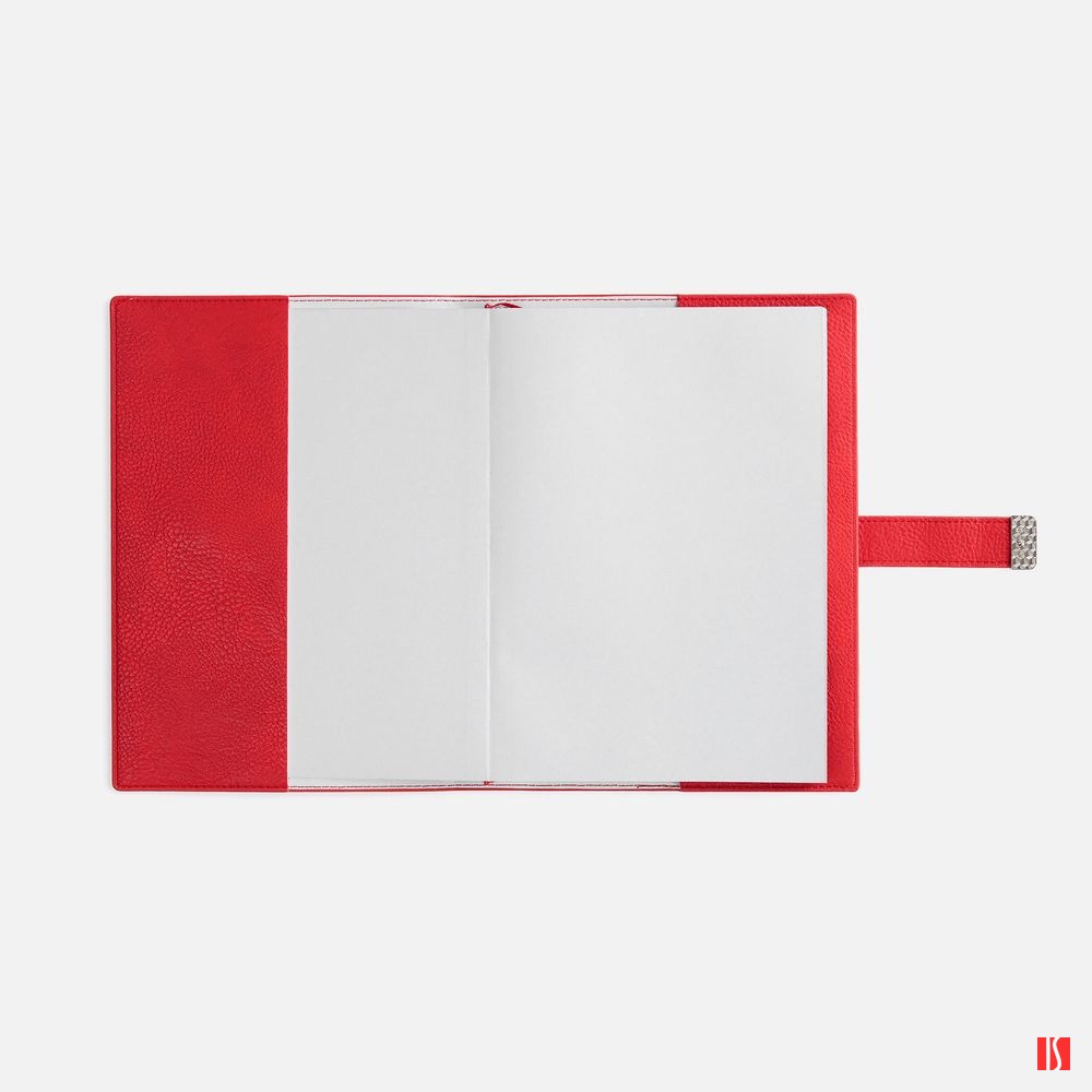 Ежедневник в мягком переплете со съемной обложкой, дополнен застежкой-хлястиком с металлическим шильдом на кнопке, двойным ляссе и капталом.