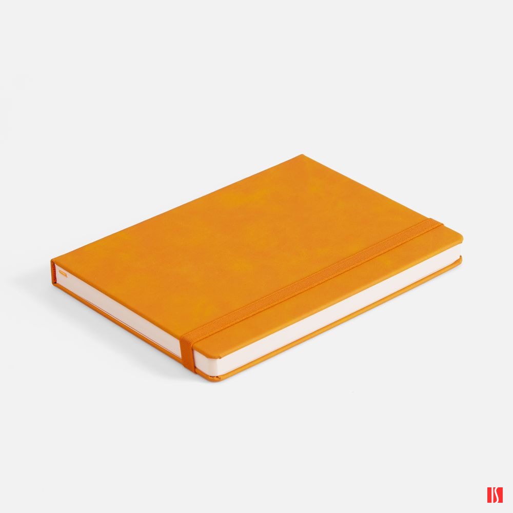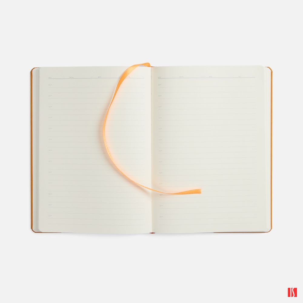Ежедневник с твердой обложкой, выполнен из материала Nubuck Touch, оранжевый OO, дополнен ляссе в цвет обложки.