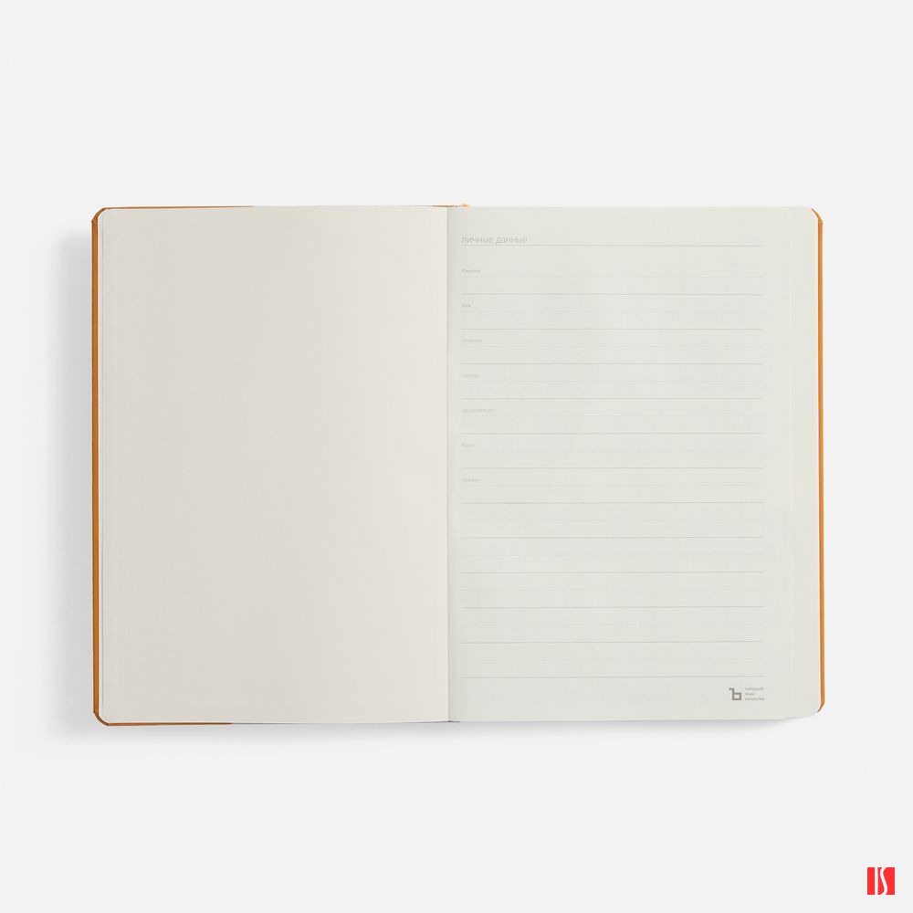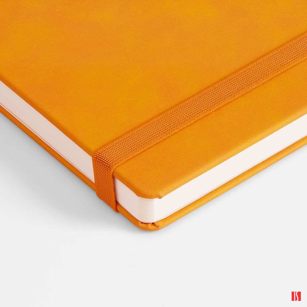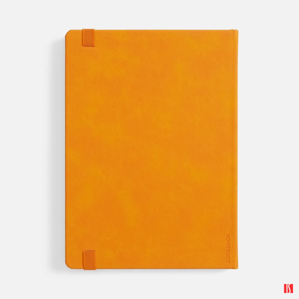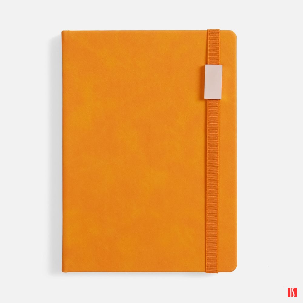 Ежедневник с твердой обложкой, выполнен из материала Nubuck Touch, оранжевый OO, дополнен ляссе в цвет обложки.