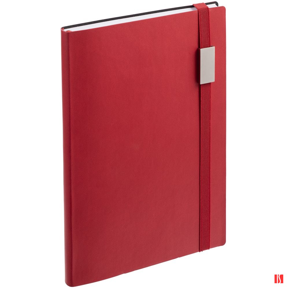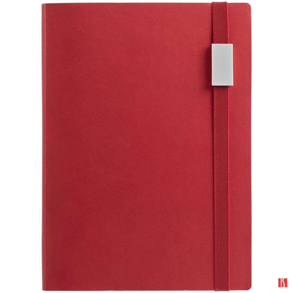 Ежедневник с гибкой обложкой, выполнен из материала Latte, красный PP, дополнен резинкой шириной 1 см с металлическим шильдом, капталом и ляссе красного цвета.