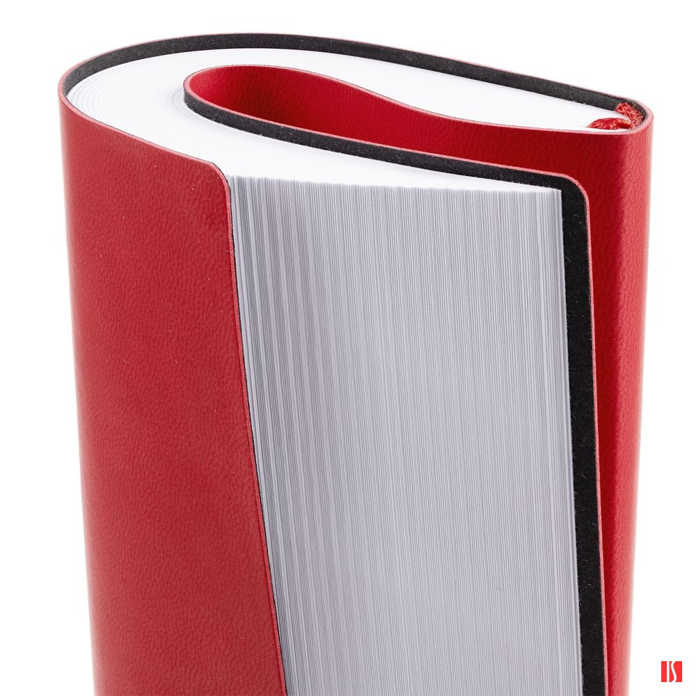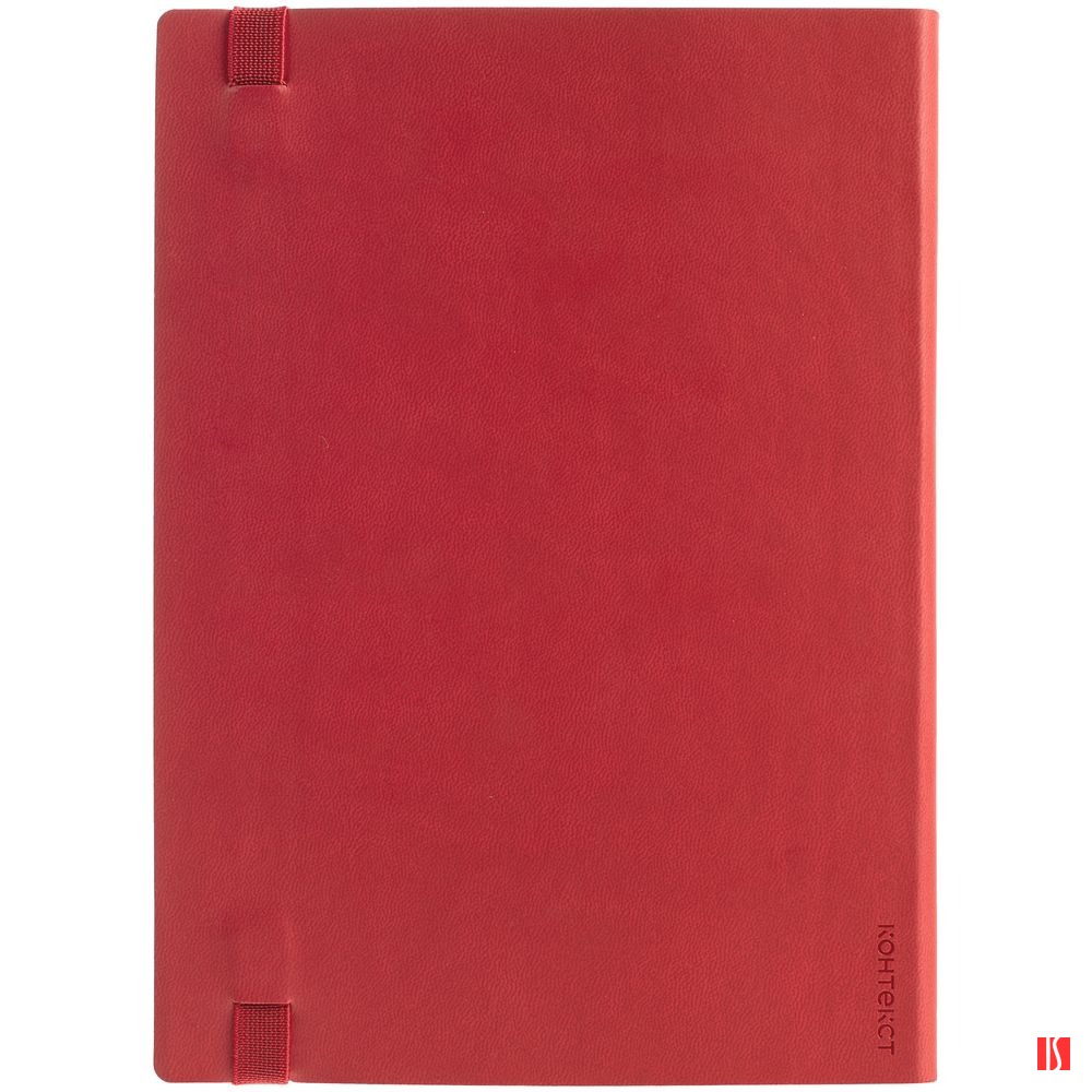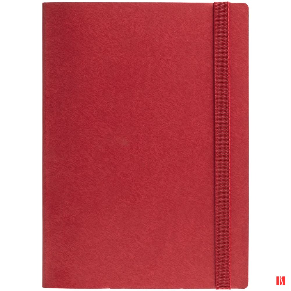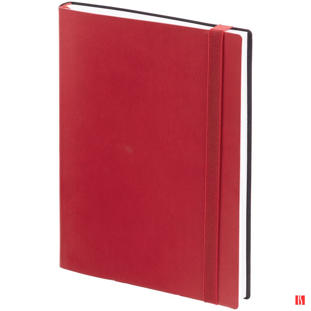 Ежедневник с гибкой обложкой выполнен из материала Latte, красный РР, и дополнен резинкой шириной 1 см, капталом и ляссе красного цвета.