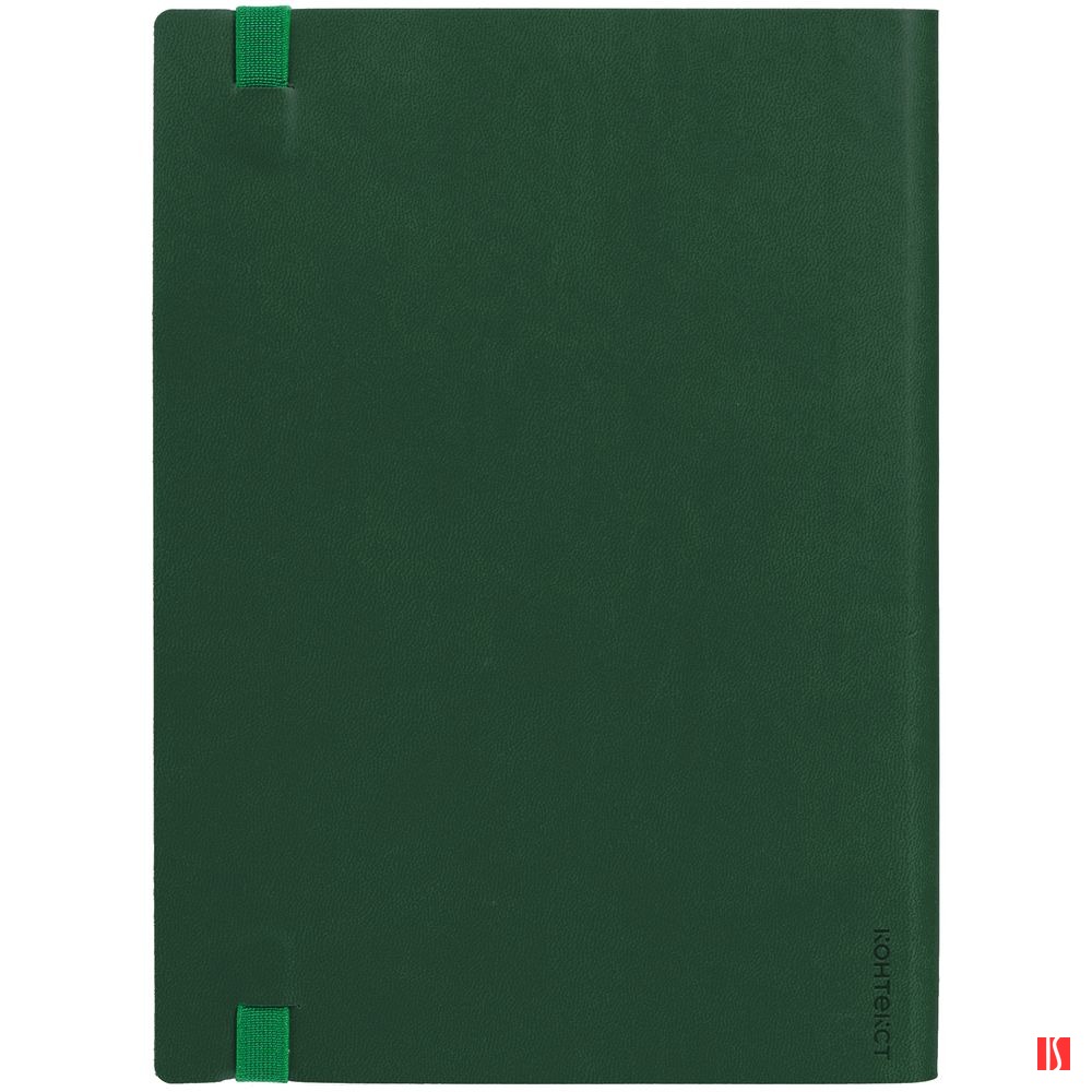Ежедневник с гибкой обложкой выполнен из материала Latte, зеленый FF, и дополнен резинкой шириной 1 см, капталом и ляссе в цвет обложки.