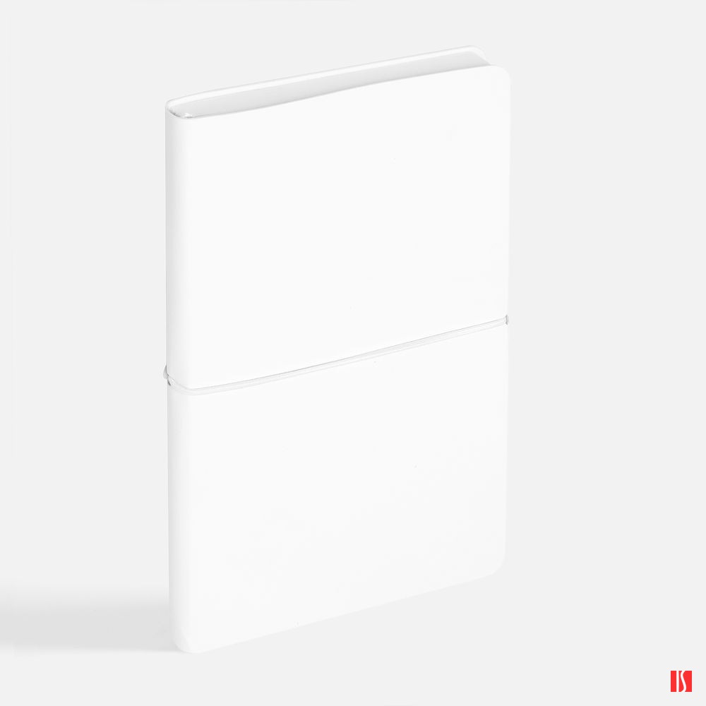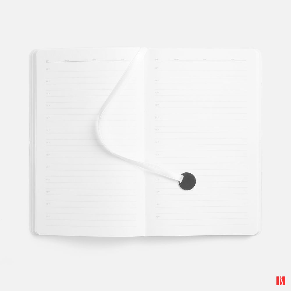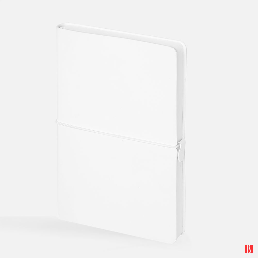 Ежедневник с гибкой обложкой, выполнен из материала Waltz, белый BB, дополнен ляссе в цвет обложки с металлическим шильдом.