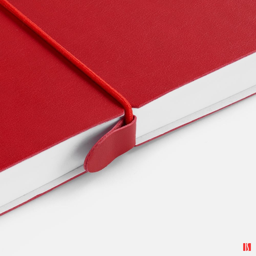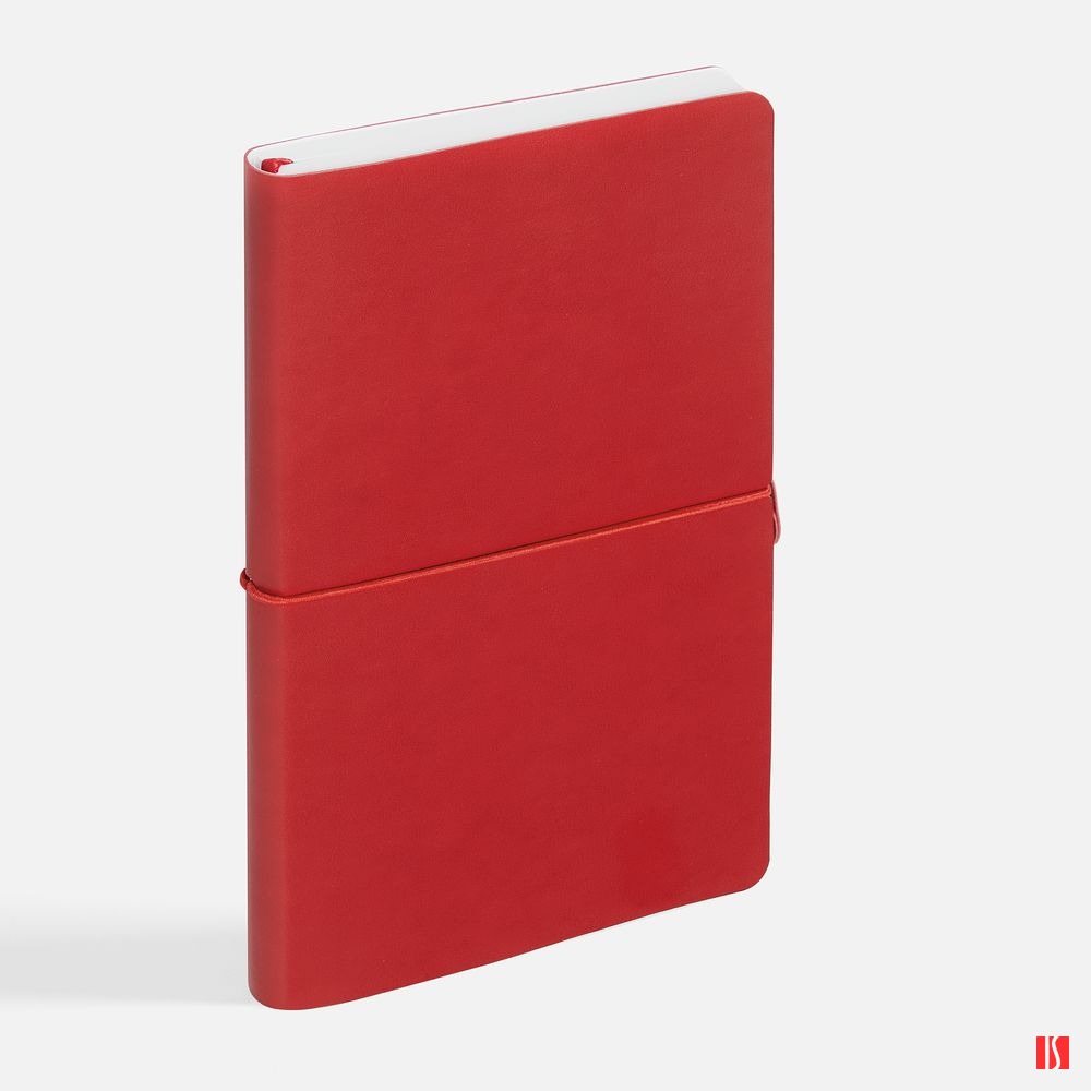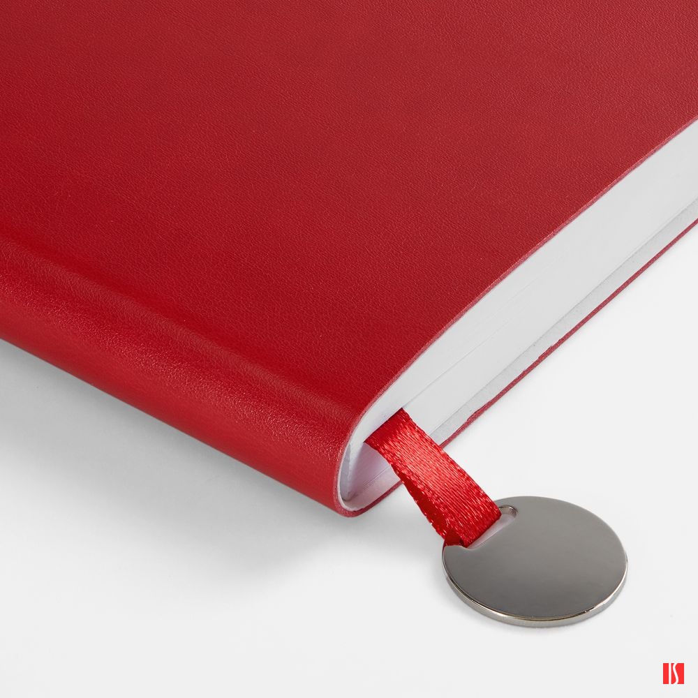 Ежедневник с гибкой обложкой, выполнен из материала Waltz, красный РР, дополнен ляссе в цвет обложки с металлическим шильдом.