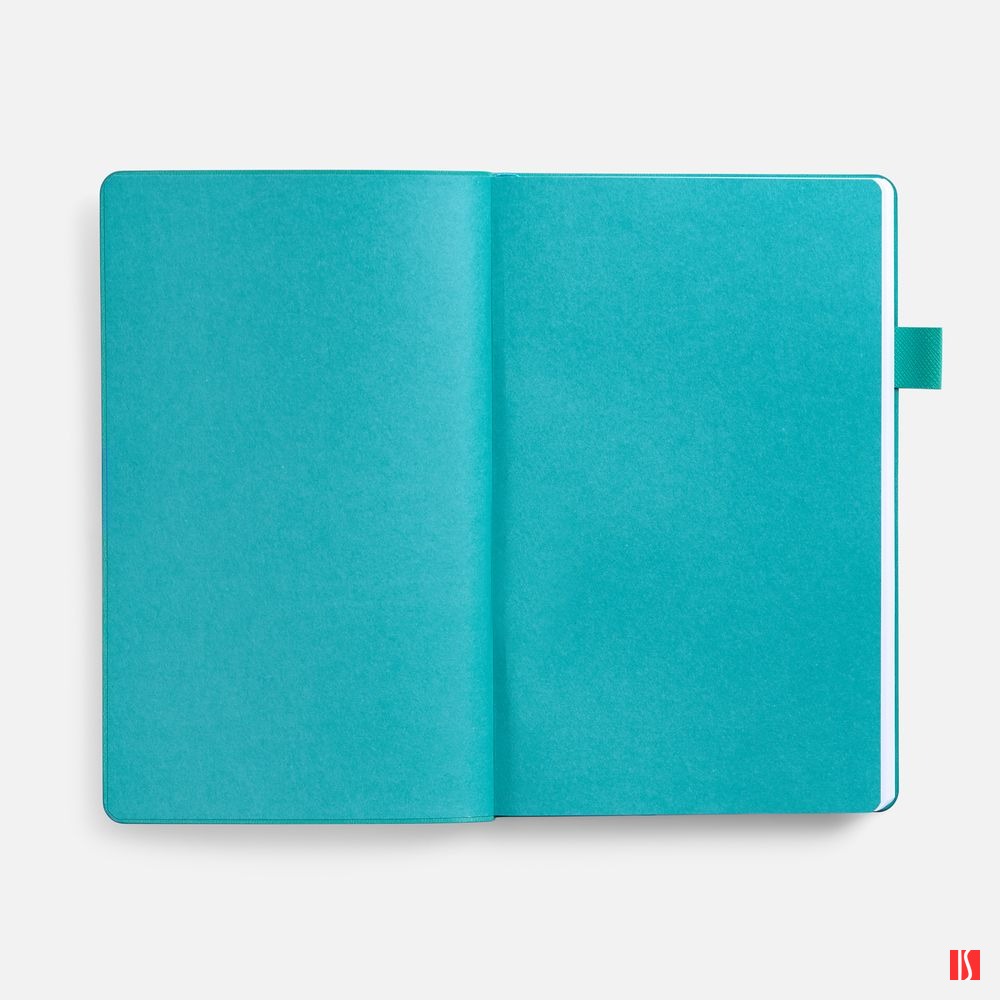 Гибкая обложка, материал обложки — Soft Touch, белый BB и Latte, цвета морской волны II; материал петли для ручки — Nice Touch, цвета морской волны II. Срез обложки окрашен в цвет морской волны.
