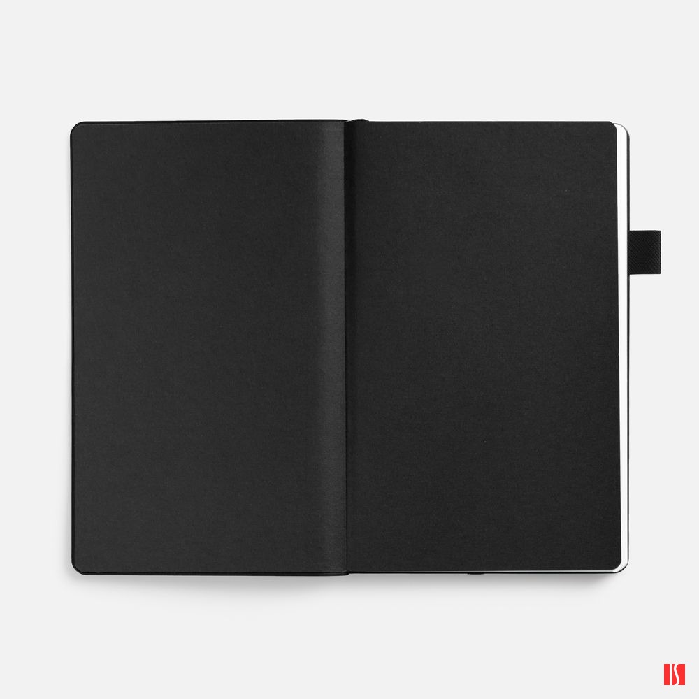 Гибкая обложка, материал обложки — Soft Touch, белый BB и Latte, черный АА; материал петли для ручки — Nice Touch, черный АА. Срез обложки окрашен в черный цвет.