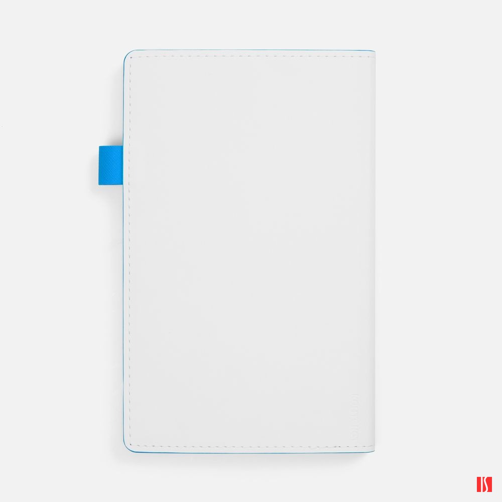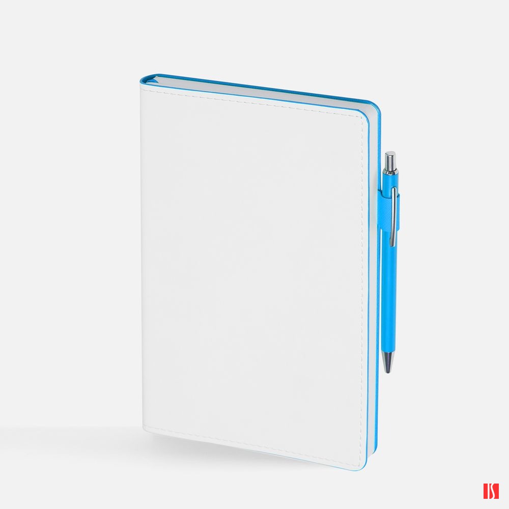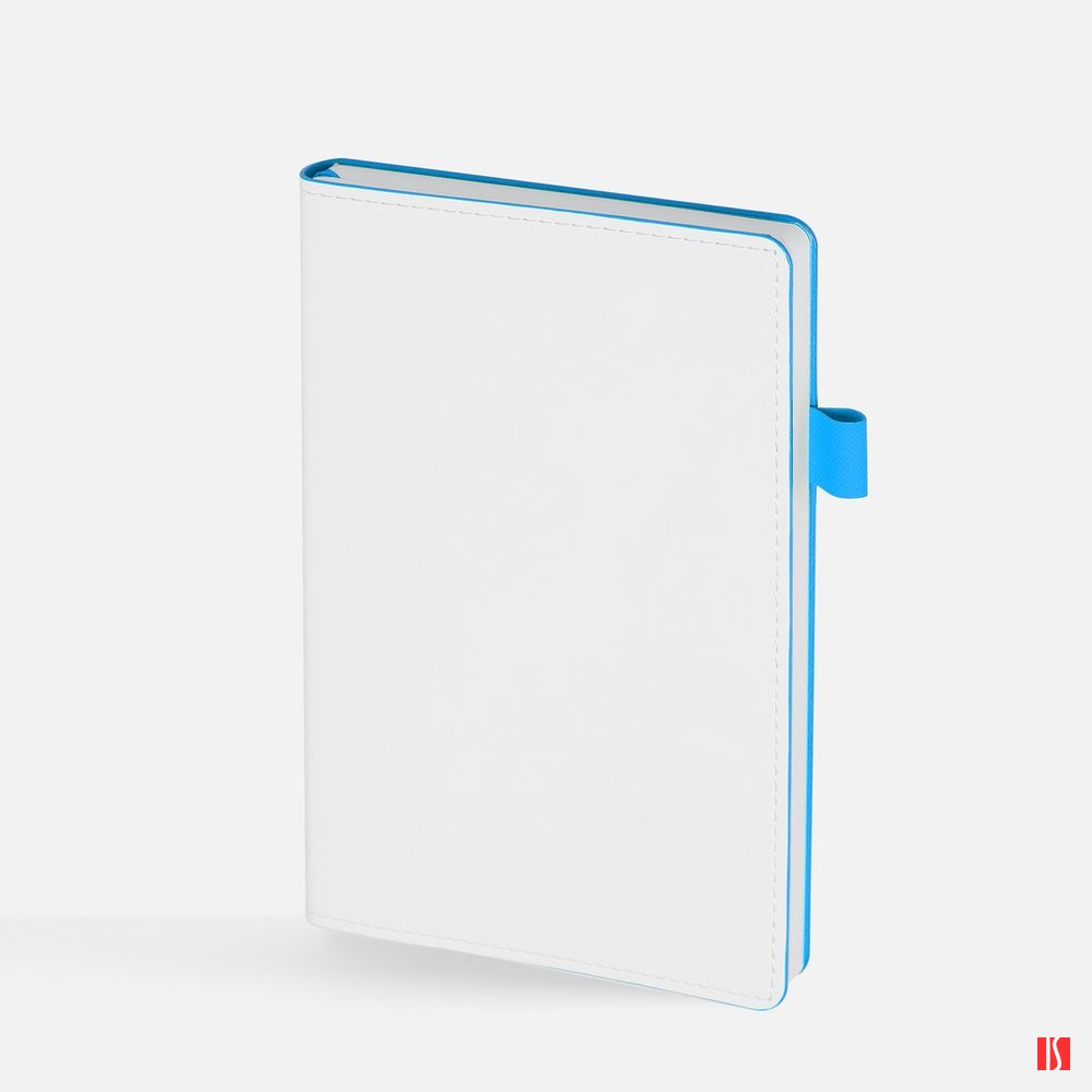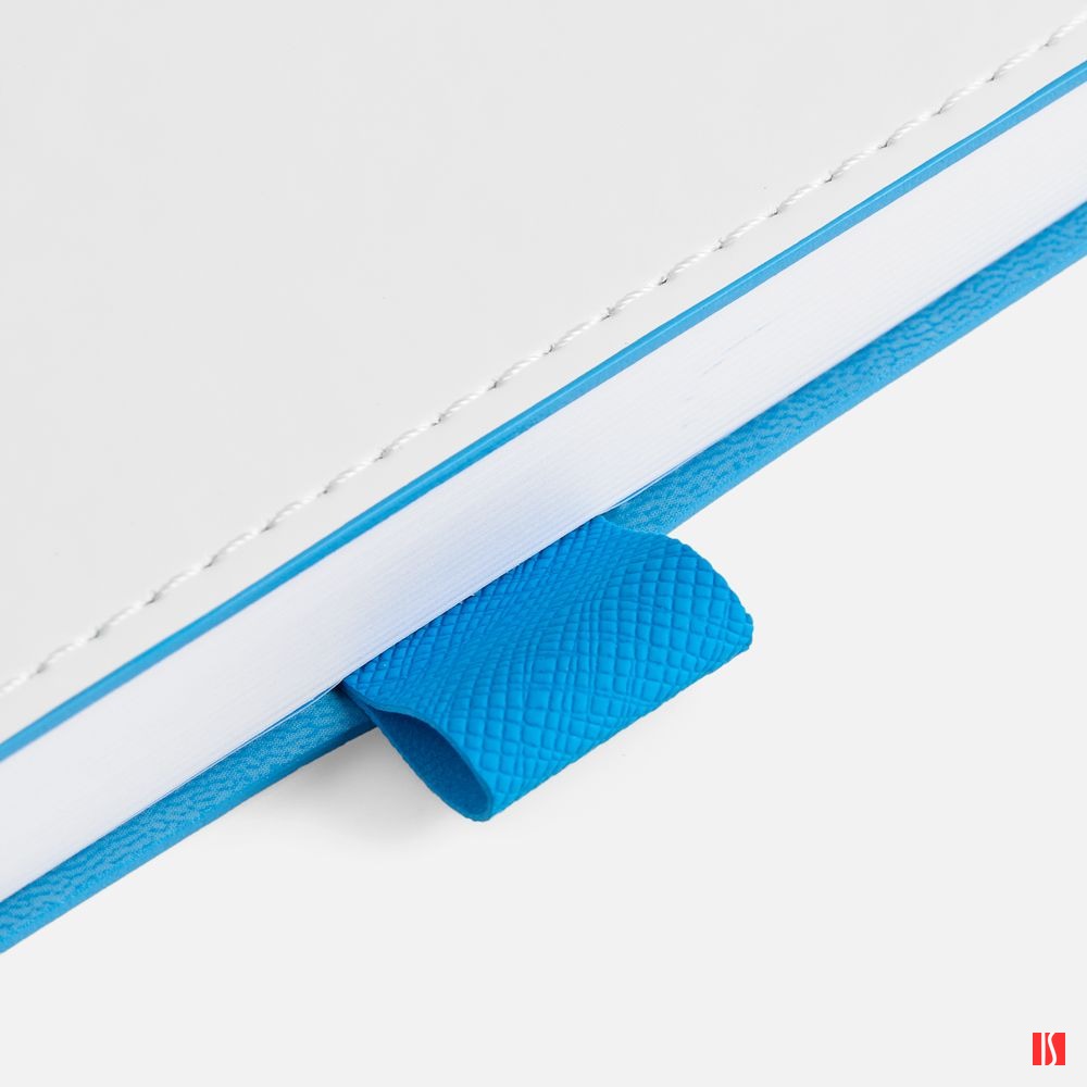 Гибкая обложка, материал обложки — Soft Touch, белый BB и Latte, голубойJJ; материал петли для ручки — Nice Touch, голубойJJ. Срез обложки окрашен в голубой цвет.
