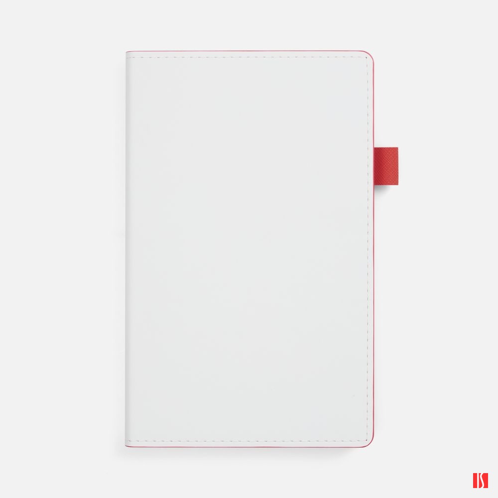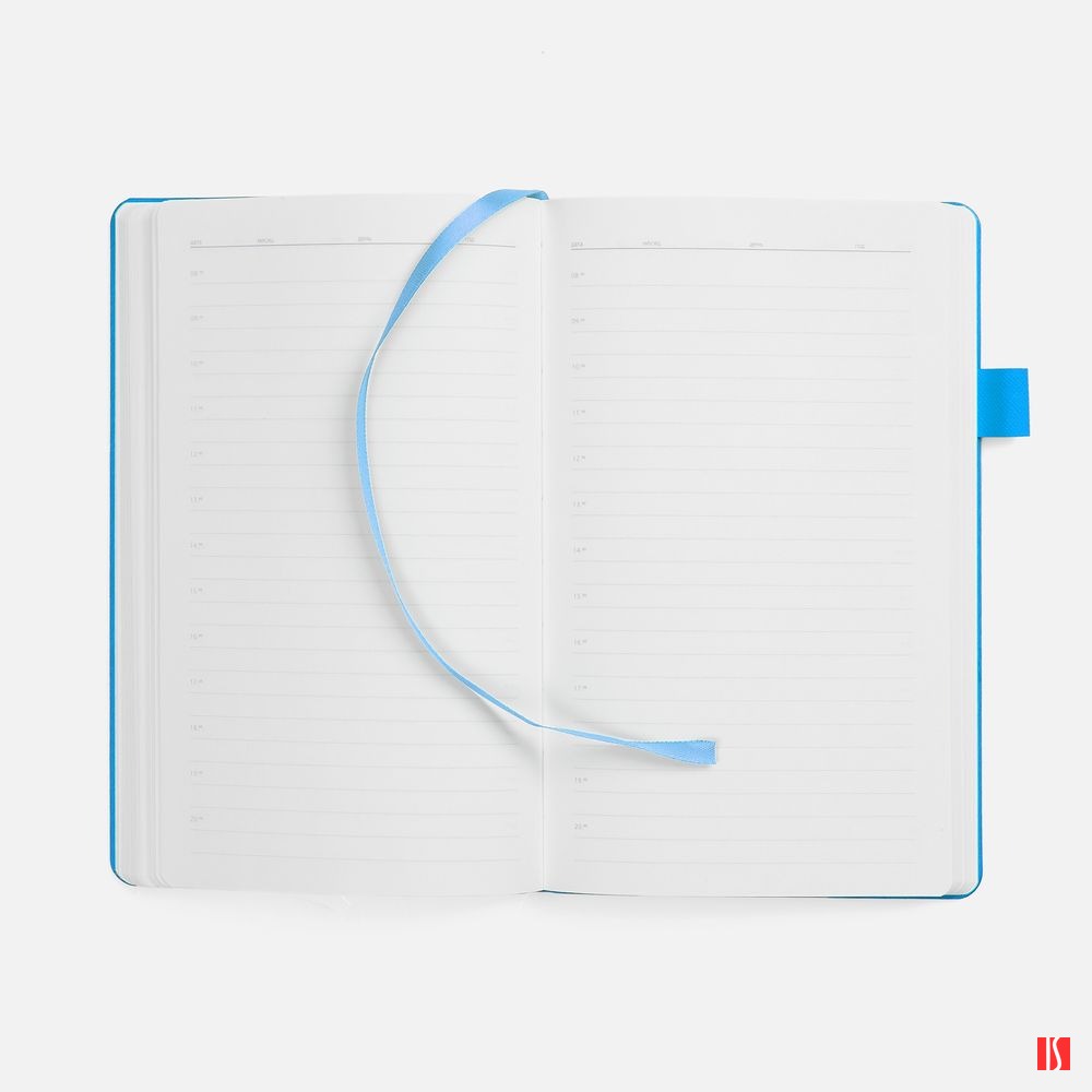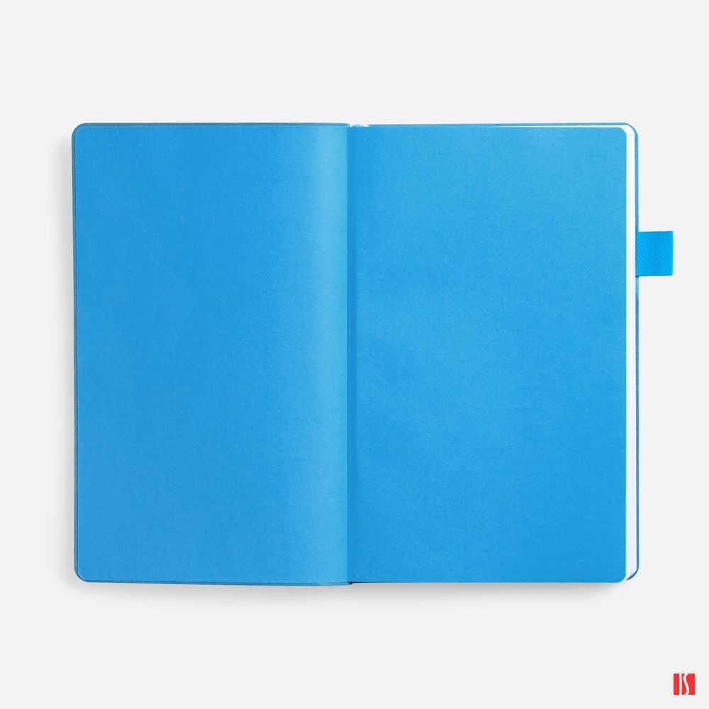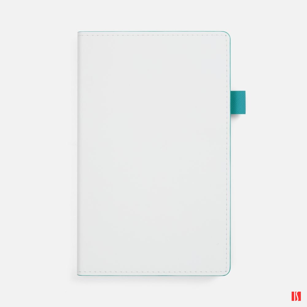 Гибкая обложка, материал обложки — Soft Touch, белый BB и Latte, голубойJJ; материал петли для ручки — Nice Touch, голубойJJ. Срез обложки окрашен в голубой цвет.