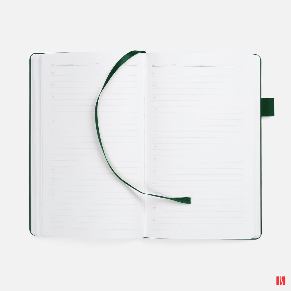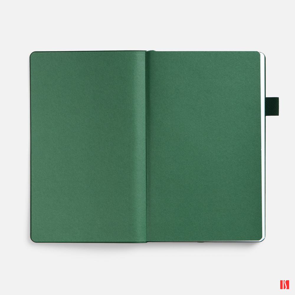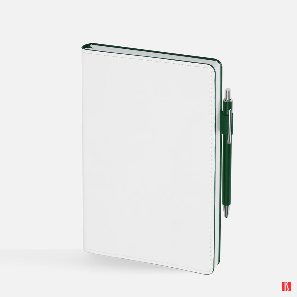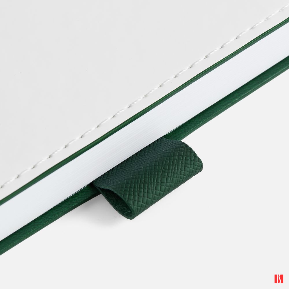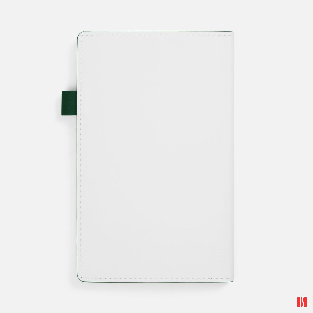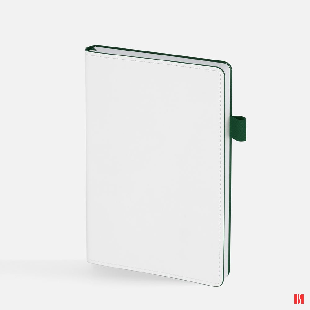 Гибкая обложка, материал обложки — Soft Touch, белый BB и Latte, зеленый FF; материал петли для ручки — Nice Touch, зеленый FF. Срез обложки окрашен в зеленый цвет.