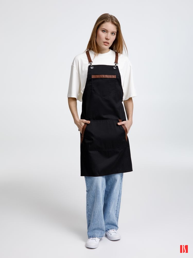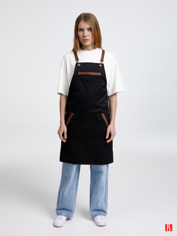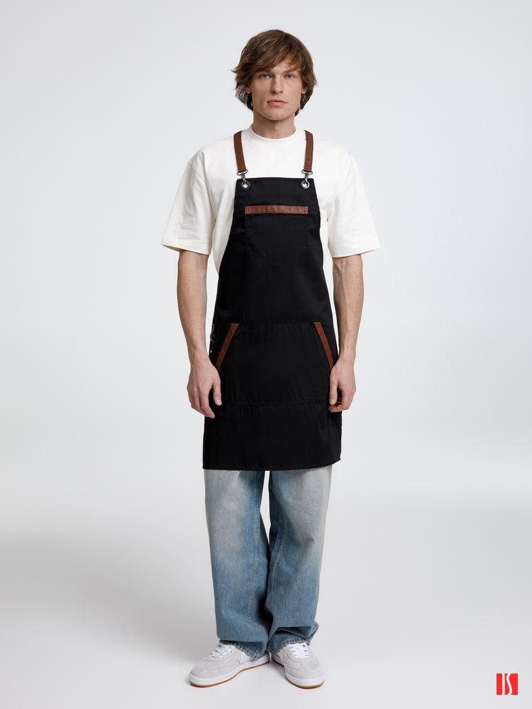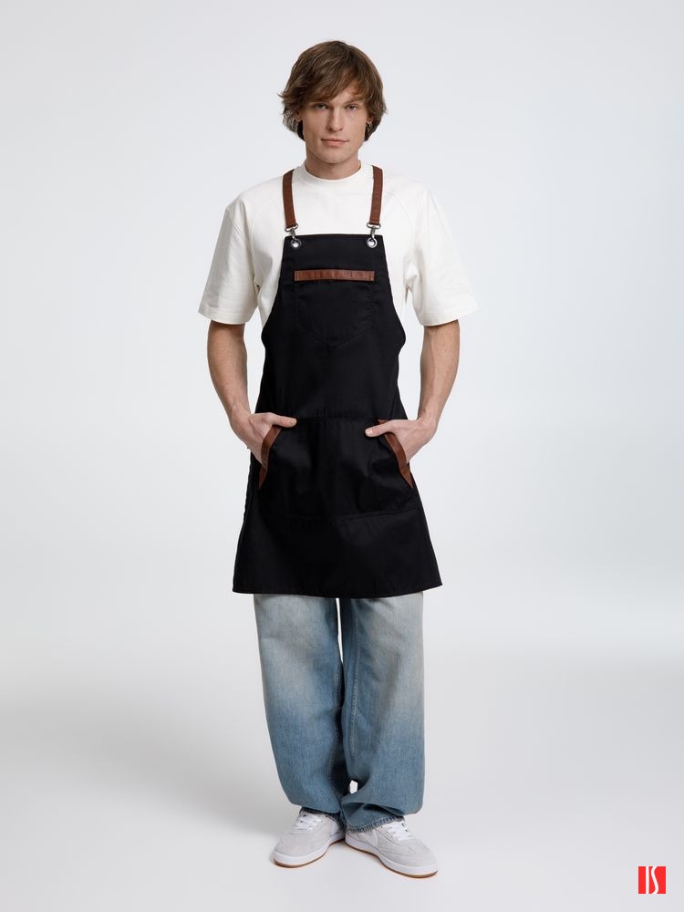 Функциональные карманы на груди и подоле эффектно украшают фартук, изготовленный из качественной дышащей плотной износостойкой ткани. Благодаря динамичным крестообразным лямкам он отлично сидит как на мужской, так и на женской фигуре. Кроме того, съемные лямки упрощают процесс стирки в стиральной машине.