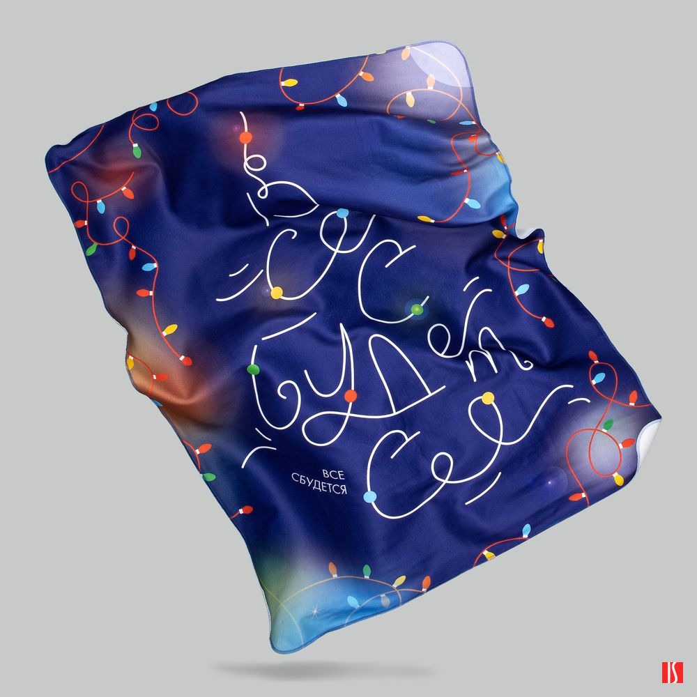 Праздничный плед-пожелание: лаконичное и воодушевляющее. Все сбудется! Стоит только загадать самое главное и стремиться к своей заветной мечте. А Вселенная подскажет, обнимет и согреет — прямо как этот красочный мягкий плед, словно по-настоящему мерцающий яркими огоньками.