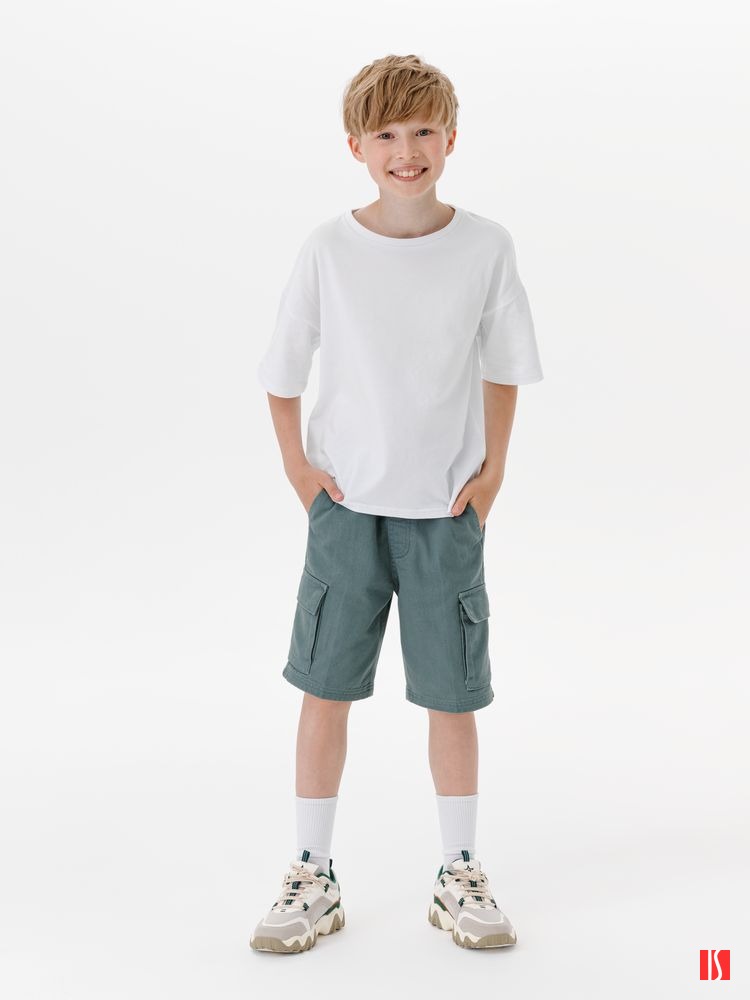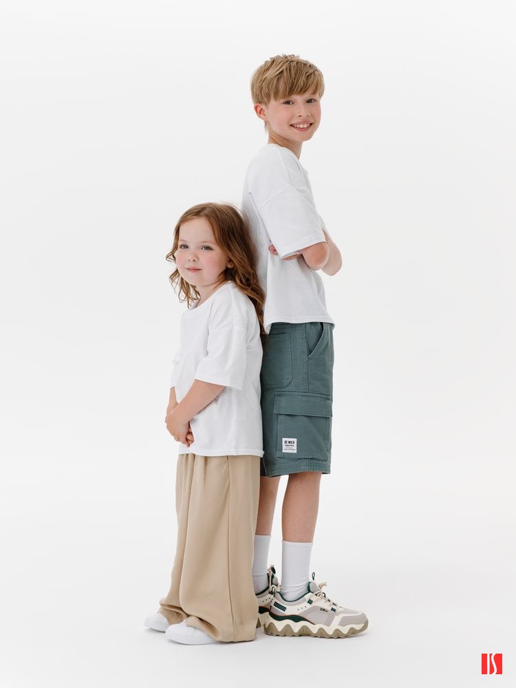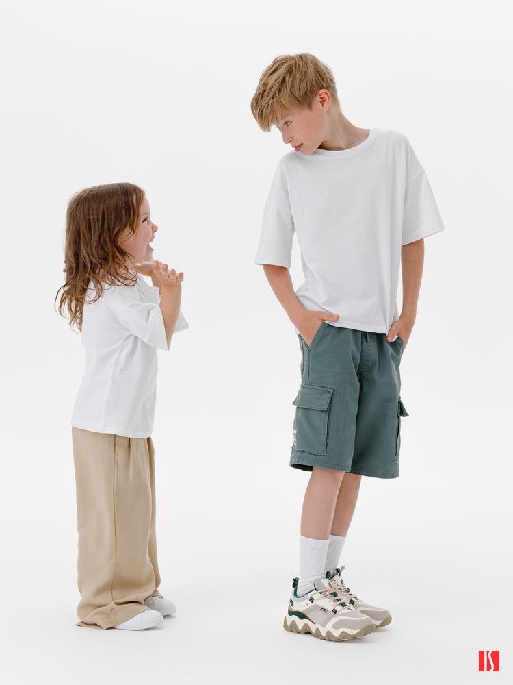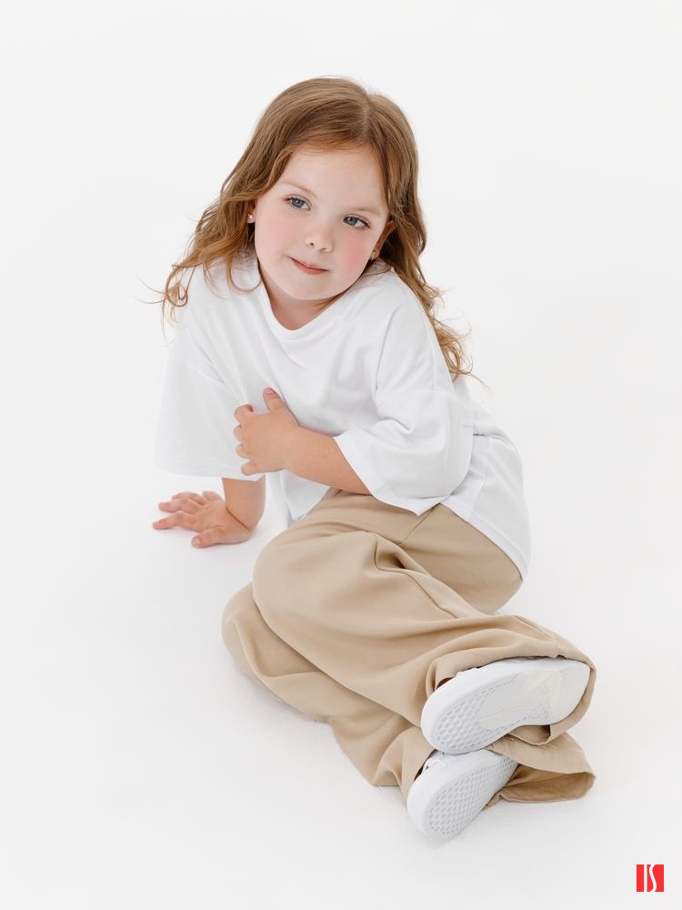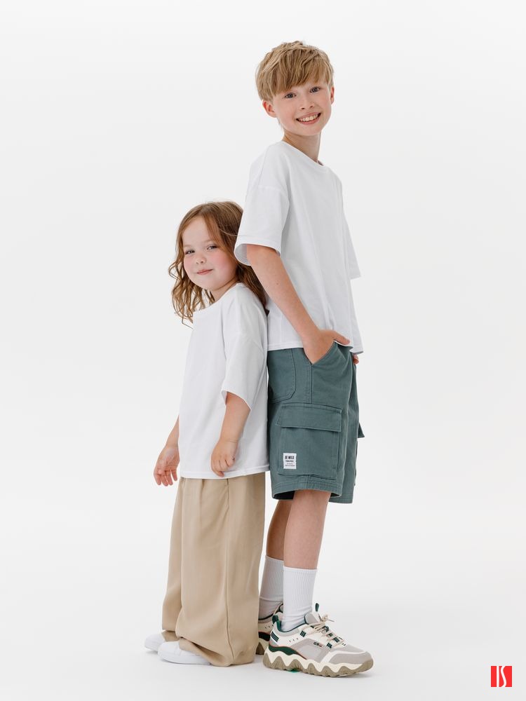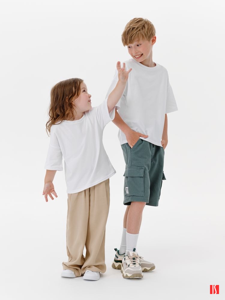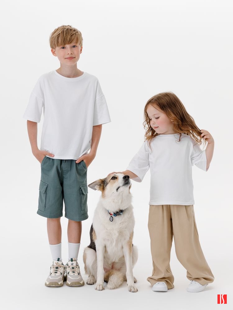 Заказать с нанесением логотипа от компании «Синтезис». Детская футболка оверсайз из гребенного хлопка с эластаном не стесняет движений и создает модный силуэт.