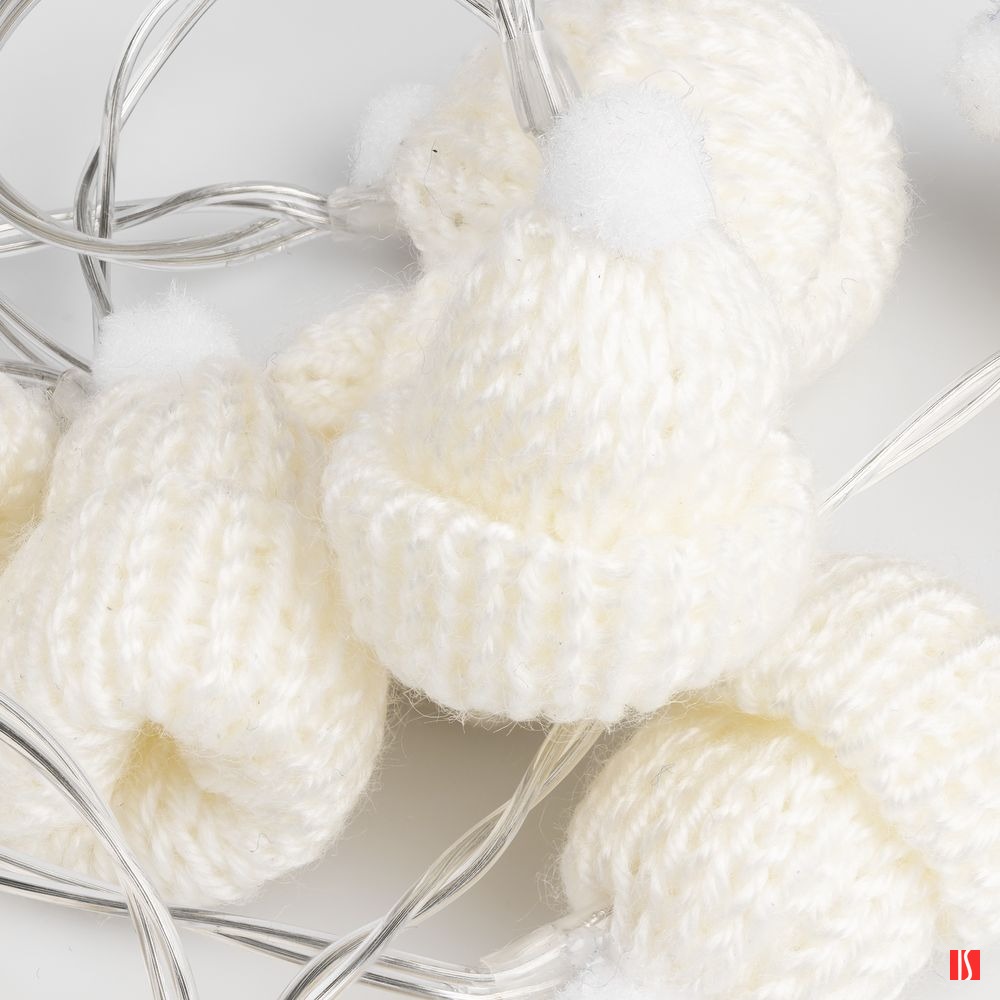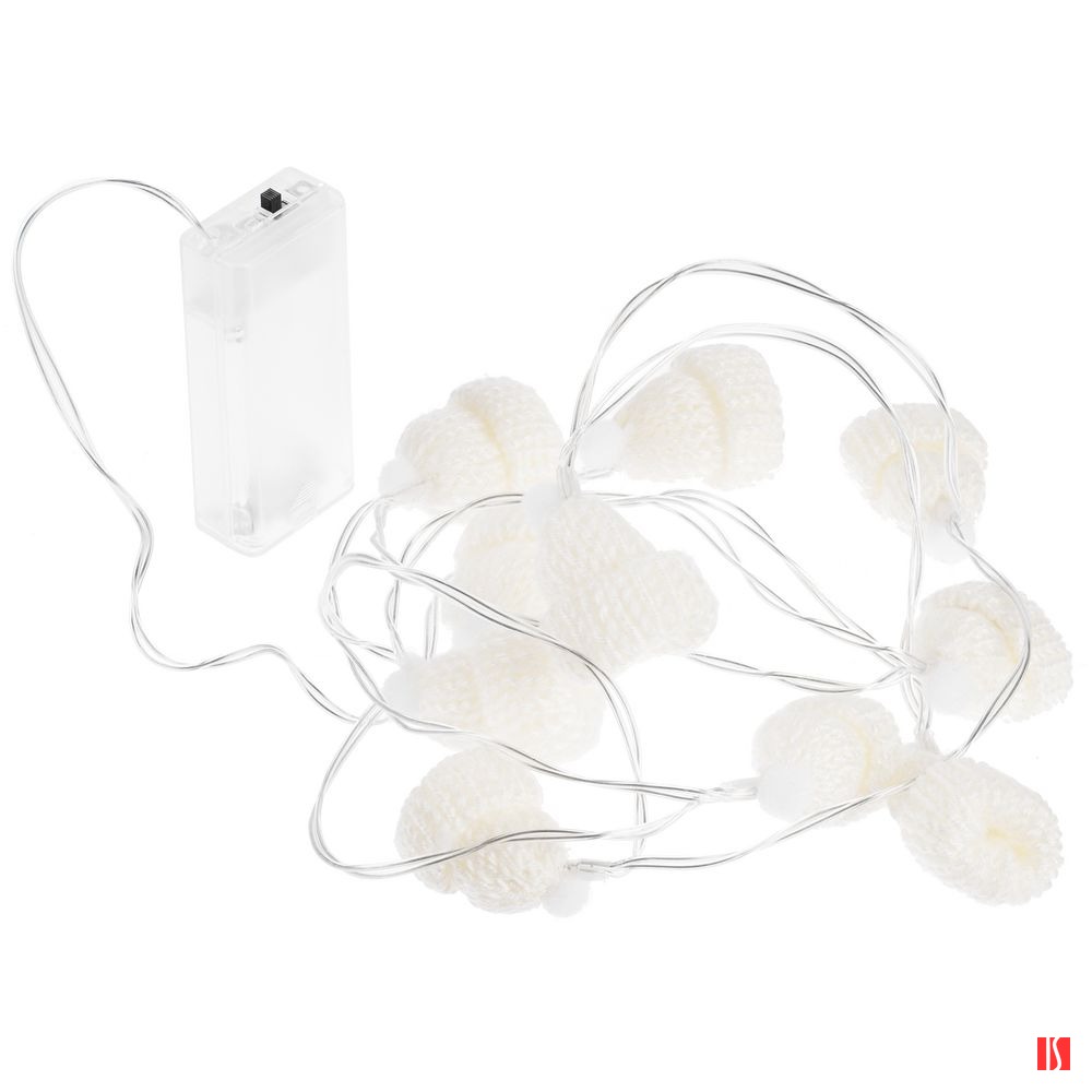 10 вязанных шапочек, а внутри лампочки с теплым светом. Работает от 2 батареек АА (в комплект не входят). Заказать с нанесением логотипа от компании «Синтезис».