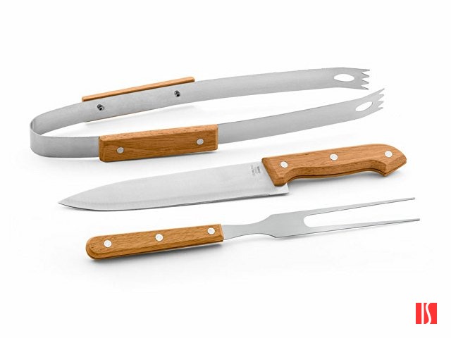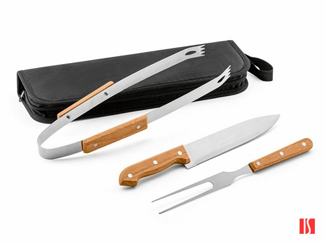Набор из 3 предметов для барбекю из дерева и нержавеющей стали. Набор из 3 предметов в жестком футляре 210D. Заказать с нанесением логотипа от компании «Синтезис».