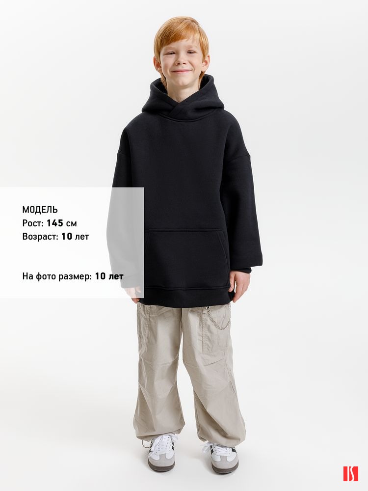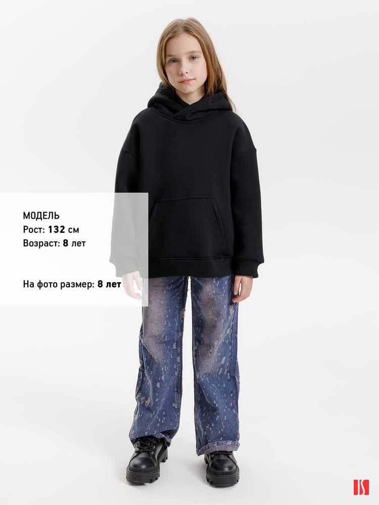Детское худи унисекс со спущенным плечом и карманом-кенгуру.