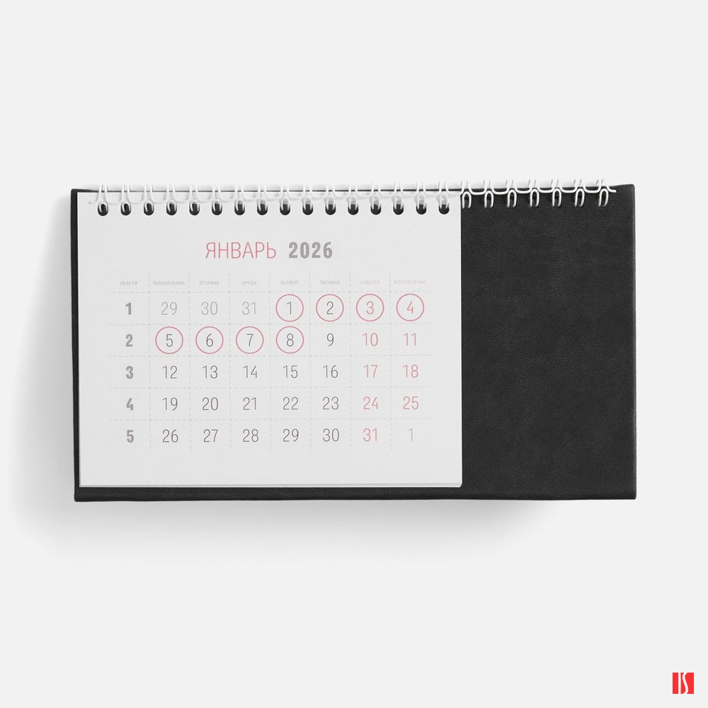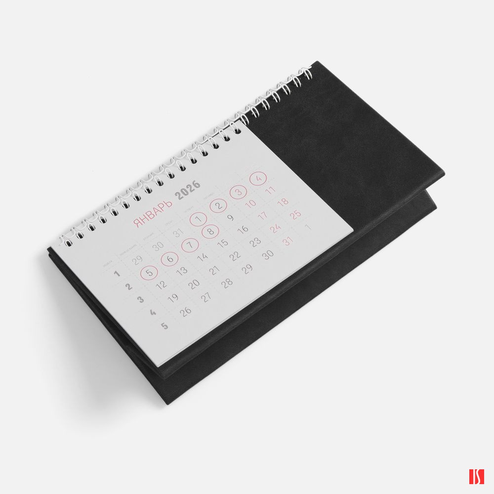 Настольный, перекидной календарь-домик выполнен из материала Latte, черный АА. Заказать с нанесением логотипа от компании «Синтезис».