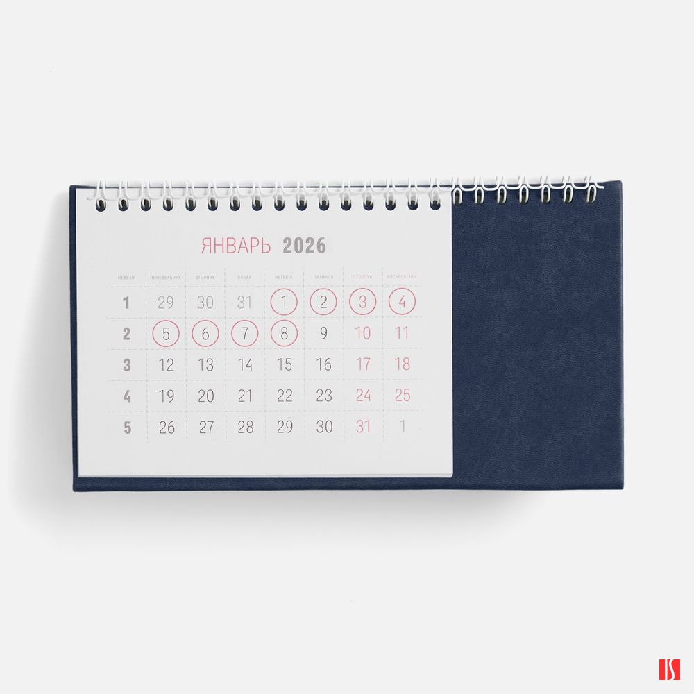 Настольный, перекидной календарь-домик выполнен из материала Latte, темно-синий ХХ. Заказать с нанесением логотипа от компании «Синтезис».