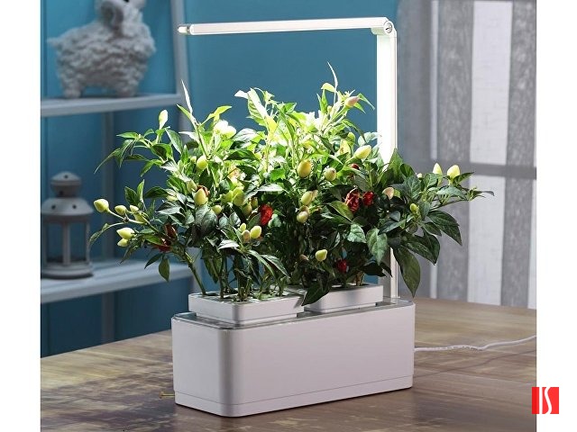 ёмкость для воды, 2 контейнера для растений, специальный грунт (вермикулит), набор семян, смарт-система управления со встроенной лампой, адаптер