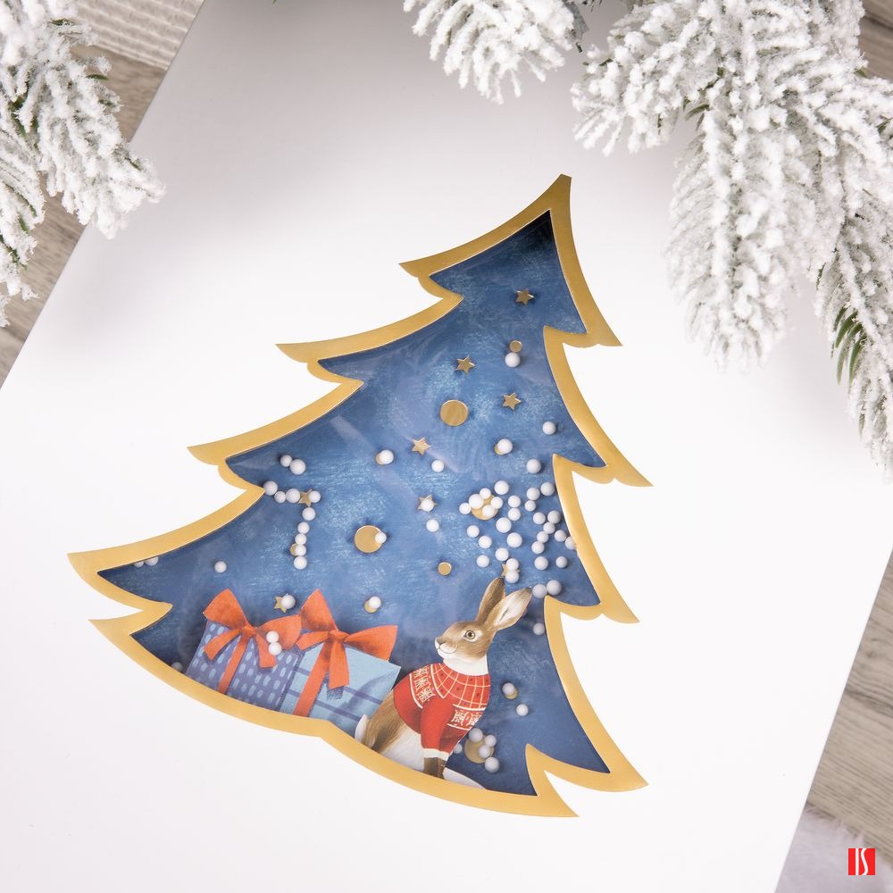 Белоснежные коробки из переплетного картона с очаровательным окошком в форме елочки создают ощущение праздника. Загляните внутрь — там вас встретит милый зайчик с подарками. 3D-иллюстрация наполняет пространство теплом и радостным предвкушением чуда, а подвижные шарики из пенопласта вызывают по-настоящему детский восторг.