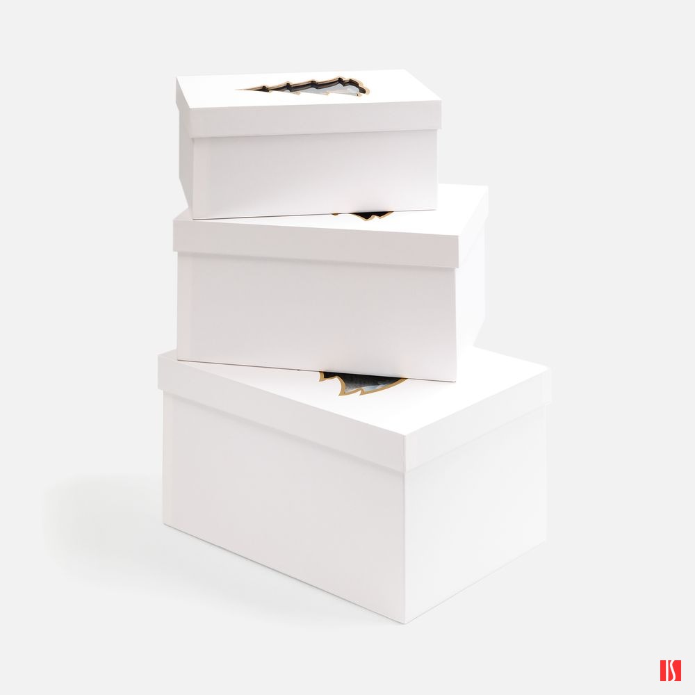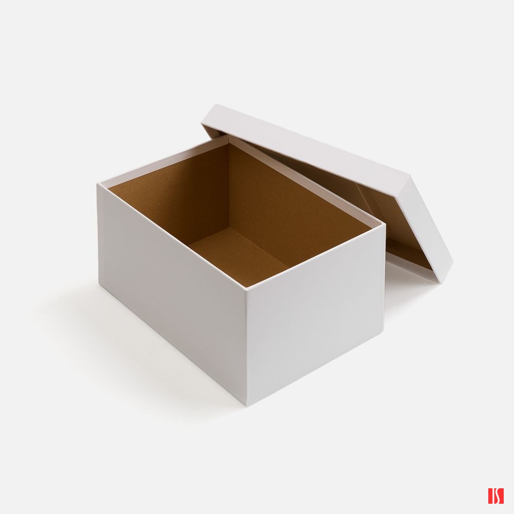 Коробка из переплетного картона, кашированного белой дизайнерской бумагой.
