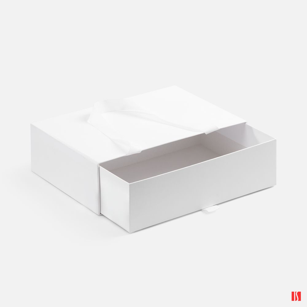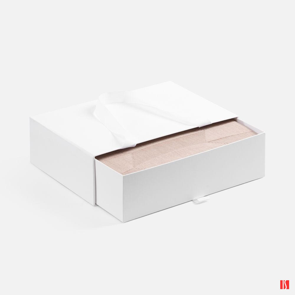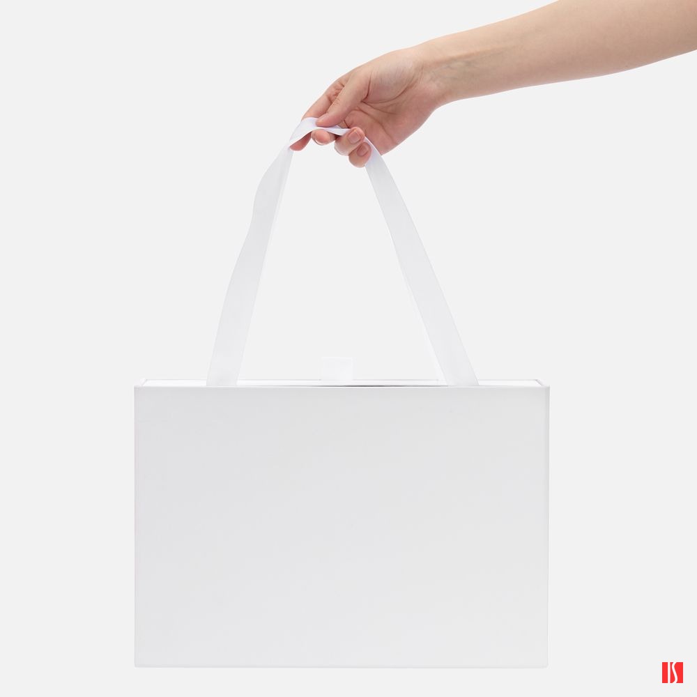 Внешний короб каширован дизайнерской бумаги и оснащен прочными ручками из репсовой ленты. Внутренний короб отделан белой бумагой, ламинированной матовой пленкой.