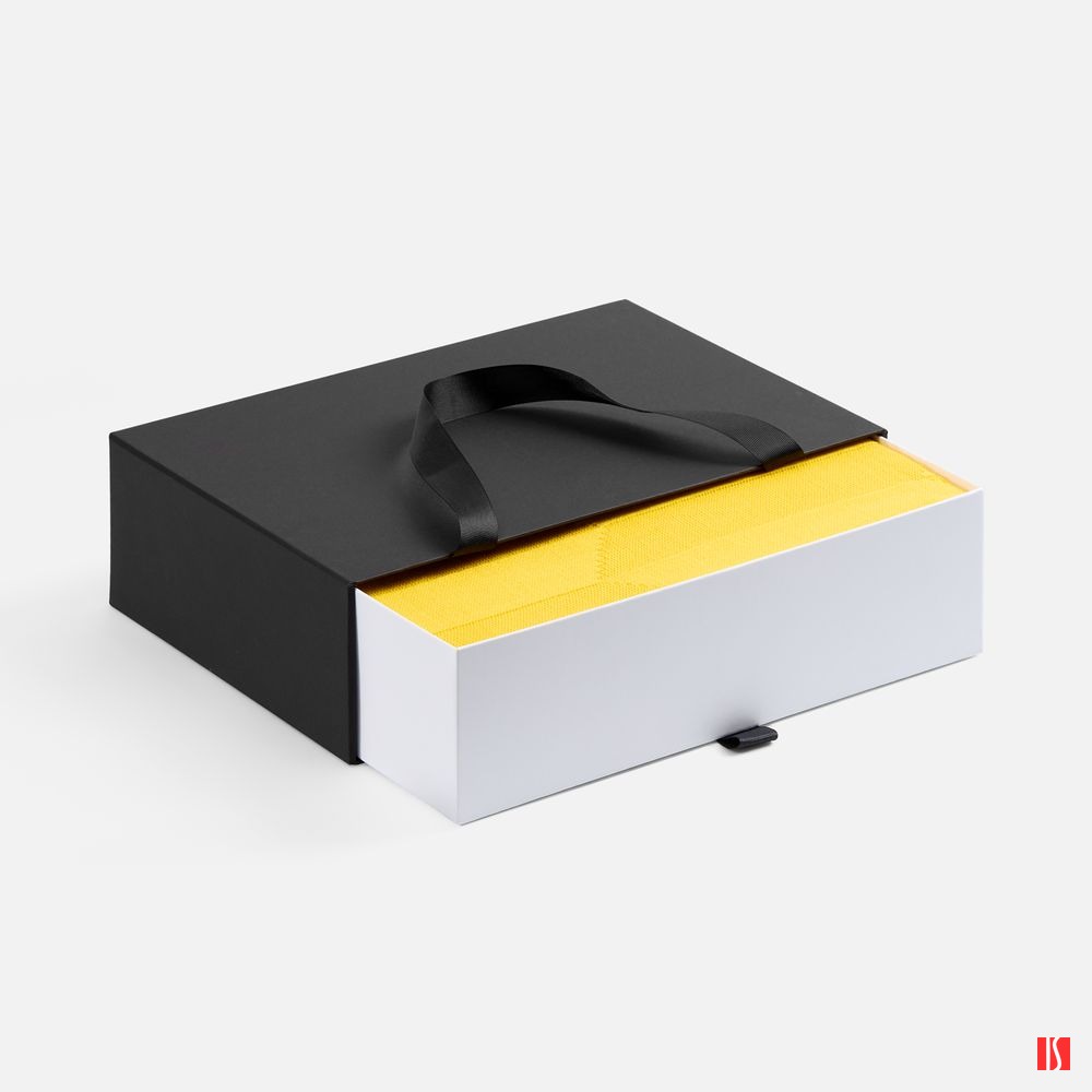 Внешний короб каширован дизайнерской бумаги и оснащен прочными ручками из репсовой ленты. Внутренний короб отделан белой бумагой, ламинированной матовой пленкой.