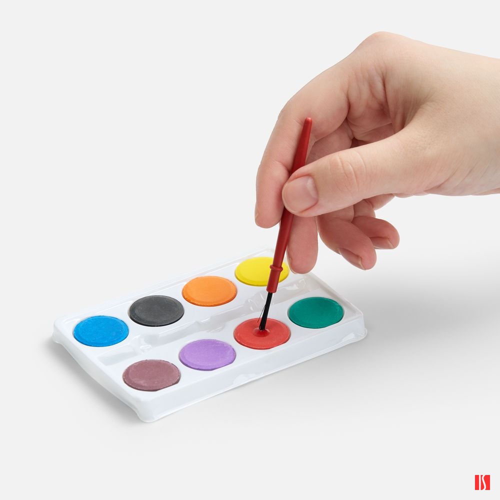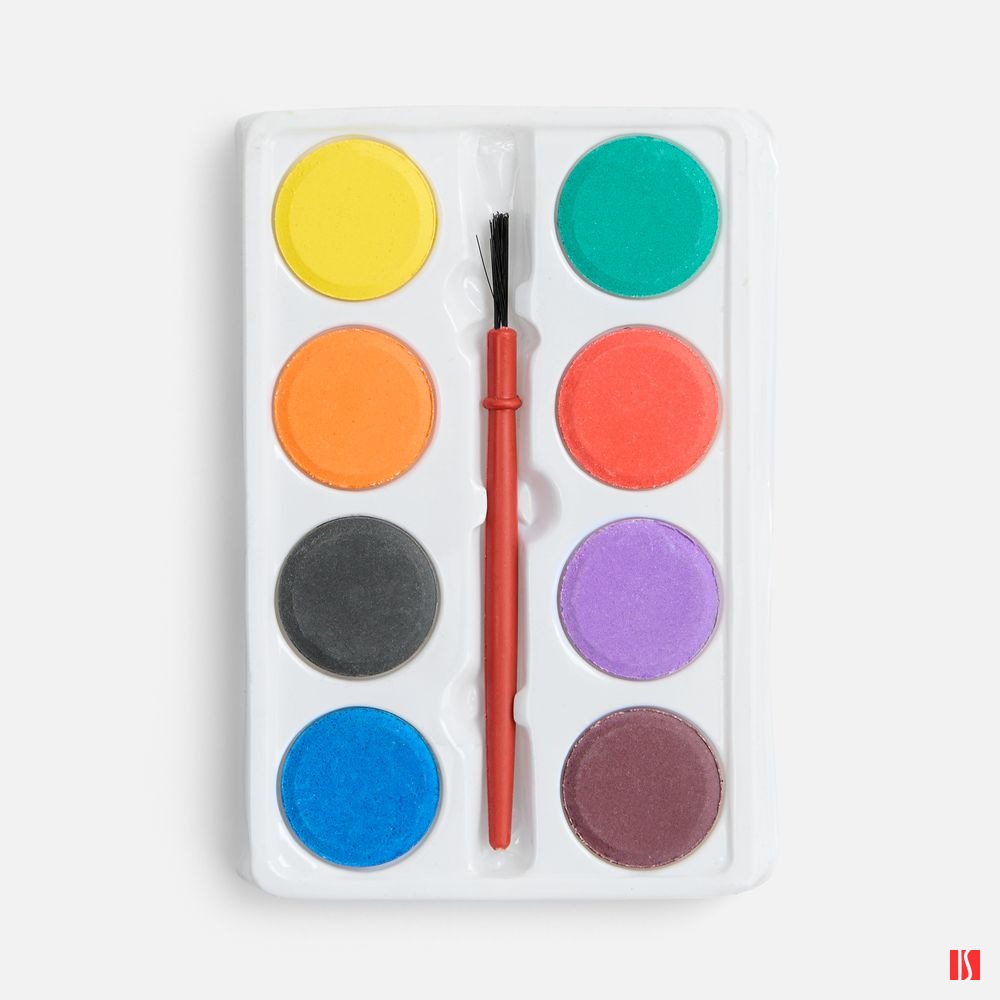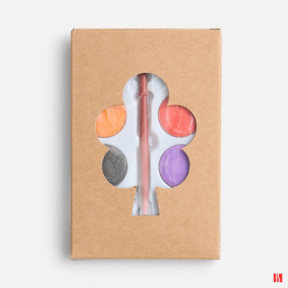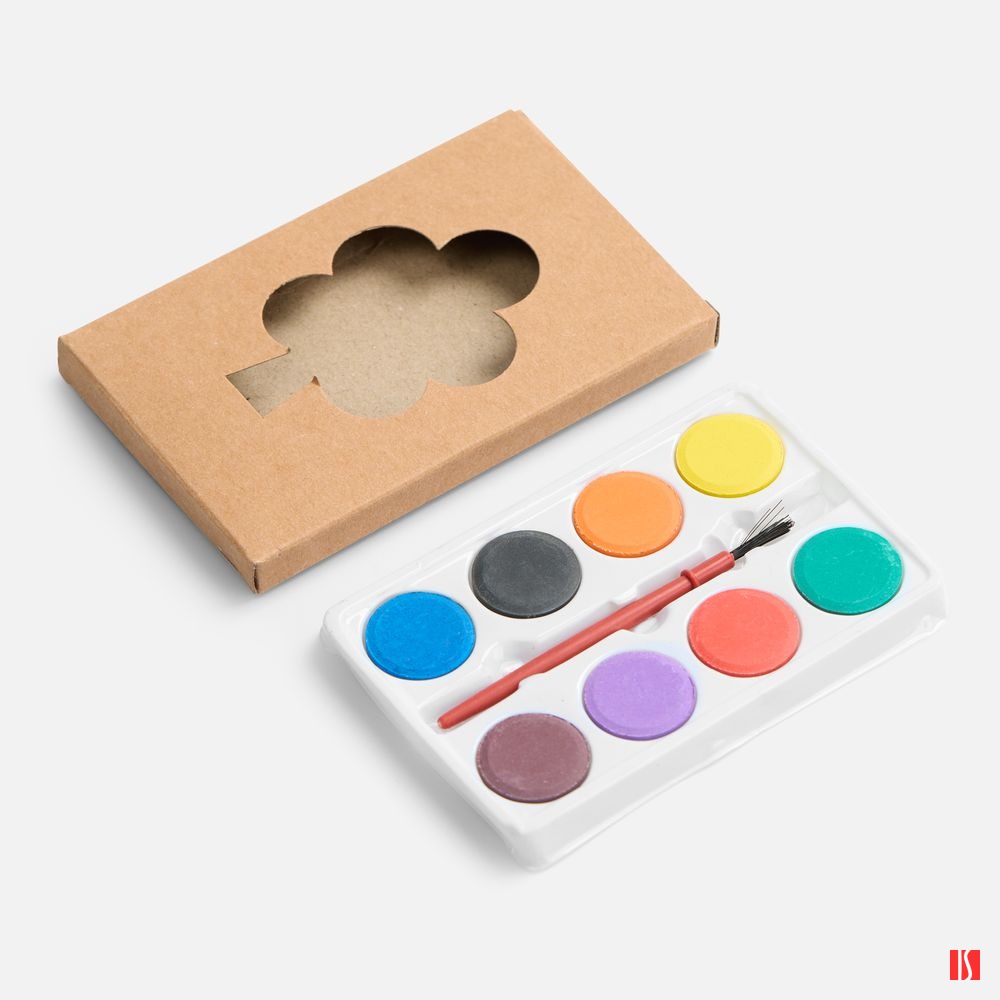 Набор из 8 акварельных красок и кисточки в коробке из крафт-бумаги.