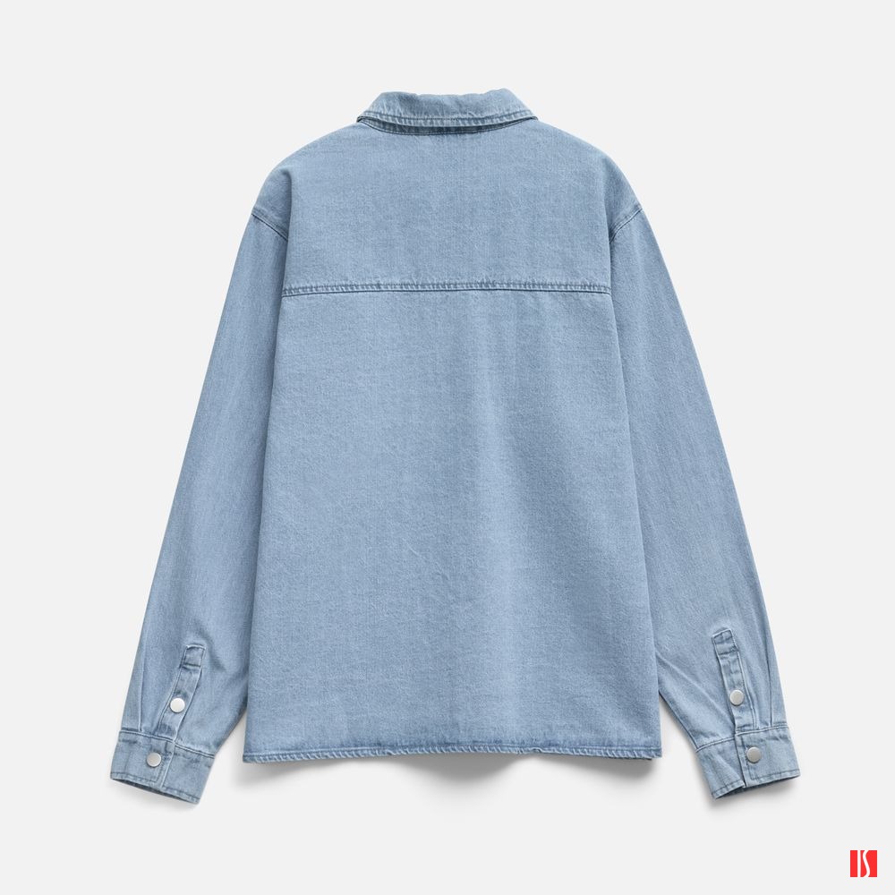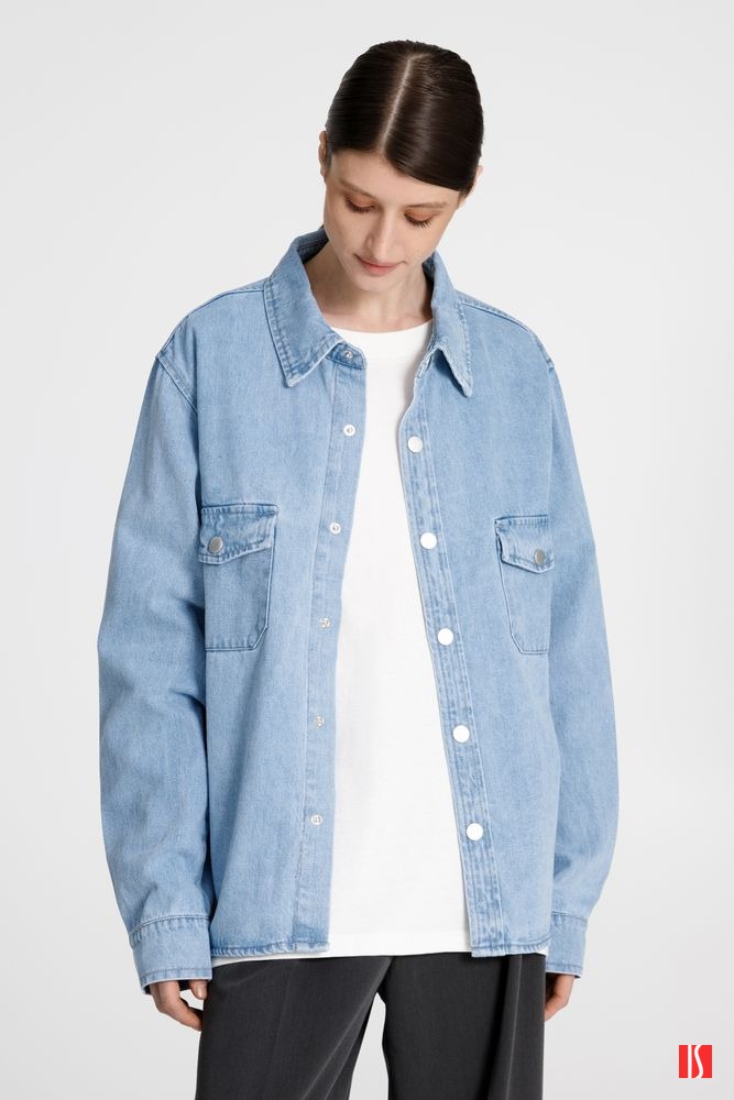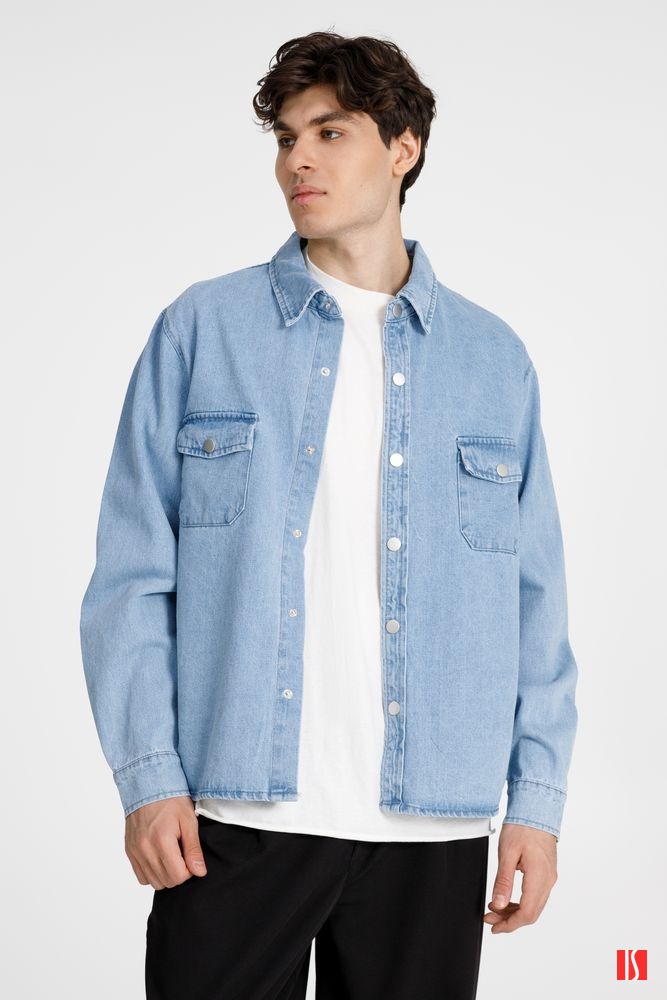 Джинсовая куртка-рубашка унисекс на кнопках прямого силуэта.