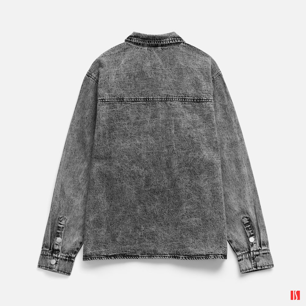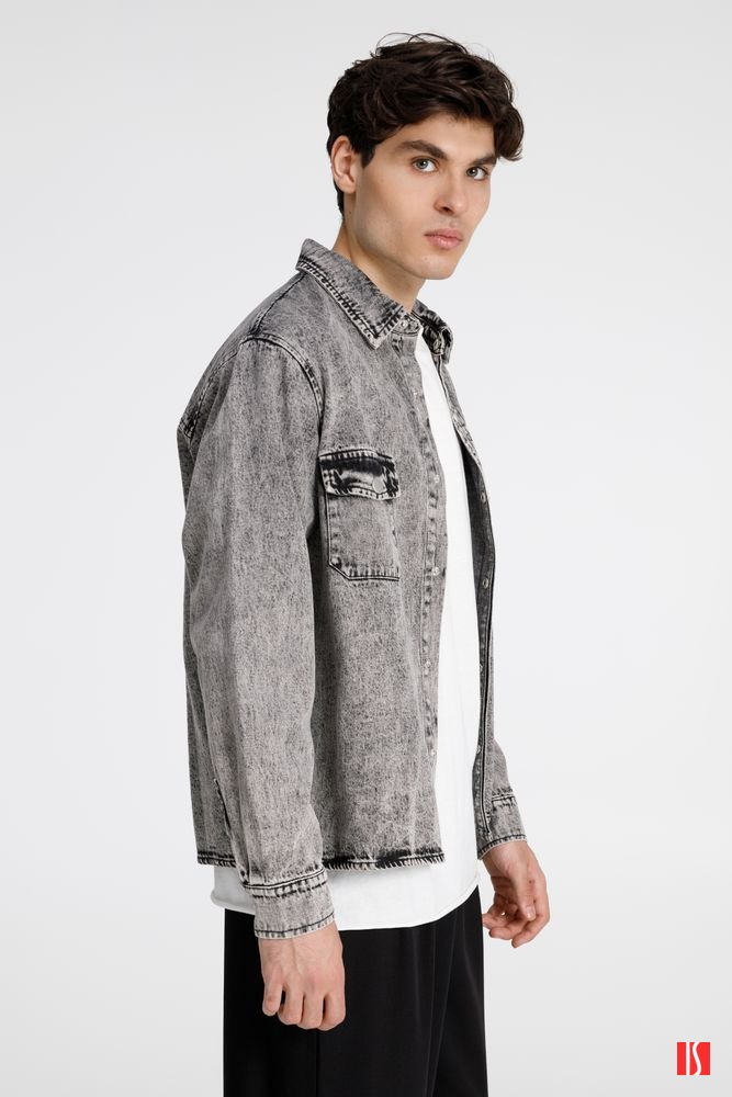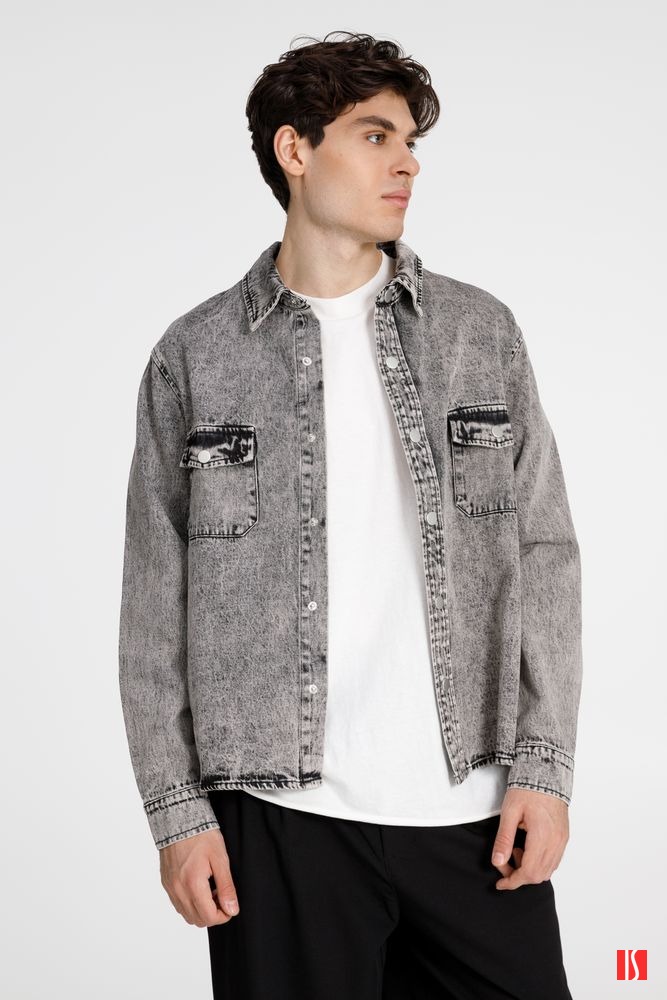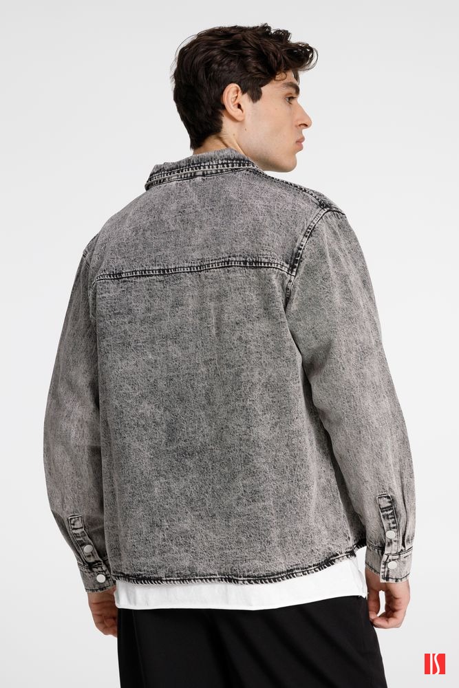 Джинсовая куртка-рубашка унисекс на кнопках прямого силуэта.