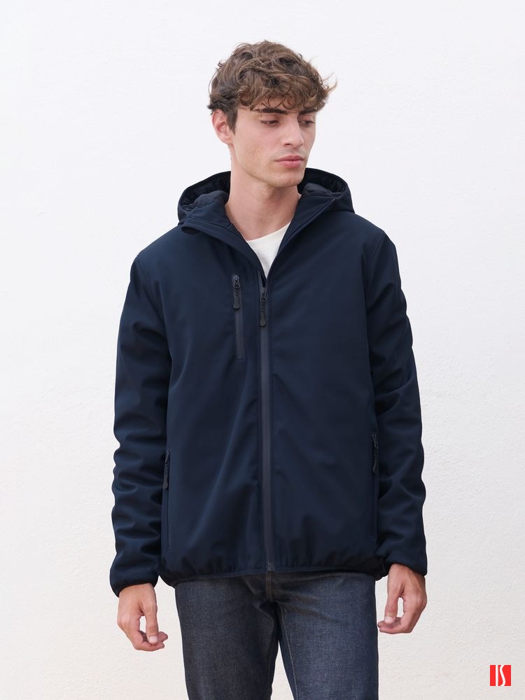 Мужская куртка софтшелл на молнии и с капюшоном.