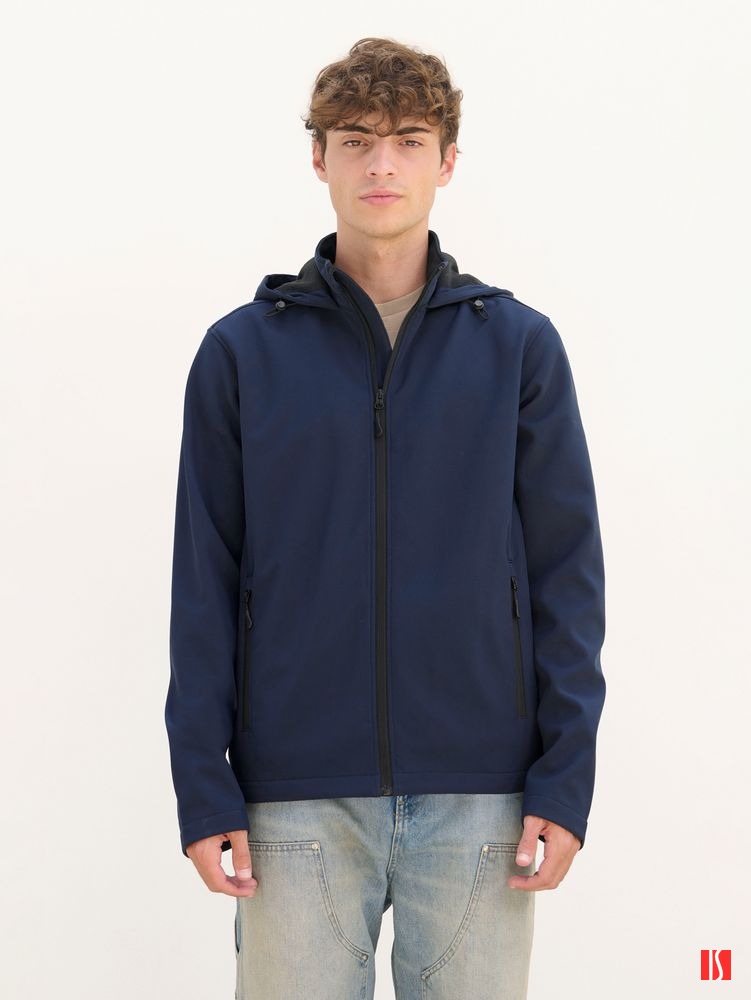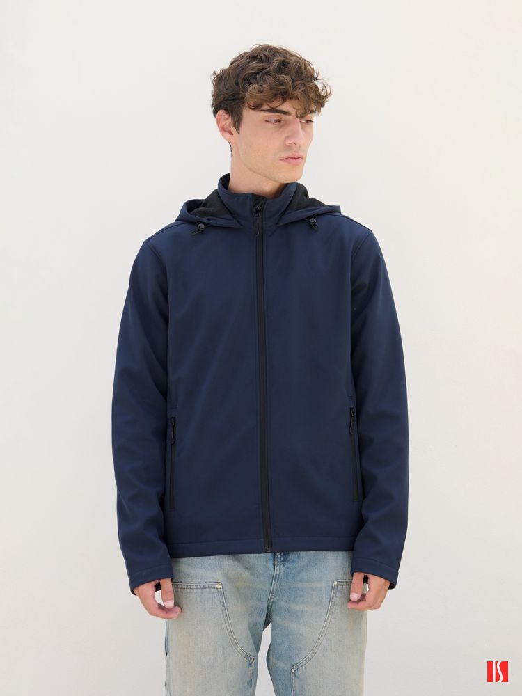 Мужская куртка софтшелл на молнии и с капюшоном.