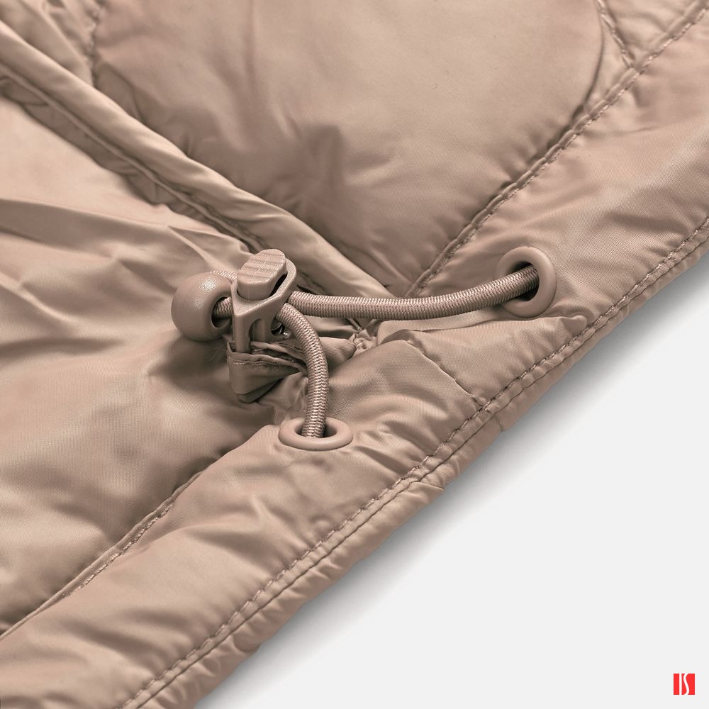 - Кулиска по низу изделия — на изнаночной стороне по боковым швам закреплены стопперы для регулировки прилегания по линии бедер