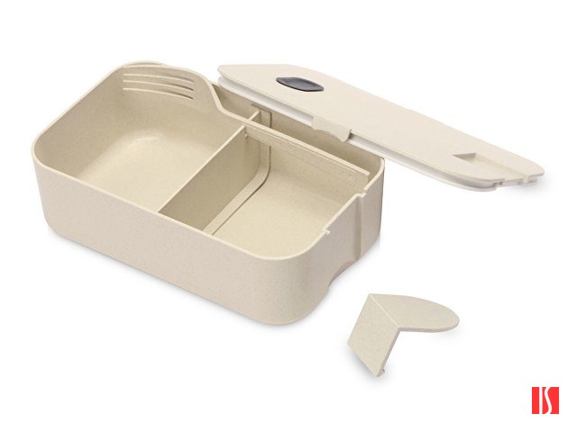 Внутри прочной пластиковой емкости находятся снимаемая перегородка и вилка. Крышка с клапаном препятствует выливанию и выпадению продуктов из бокса.