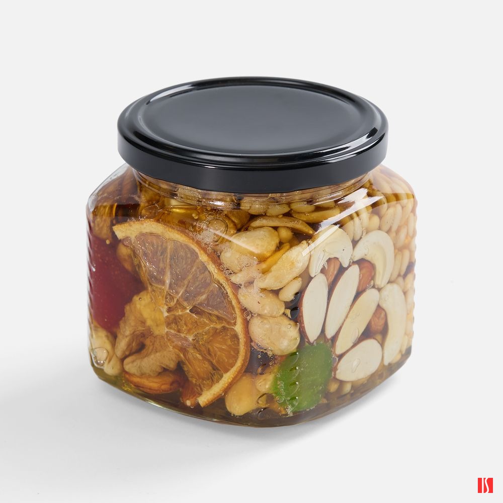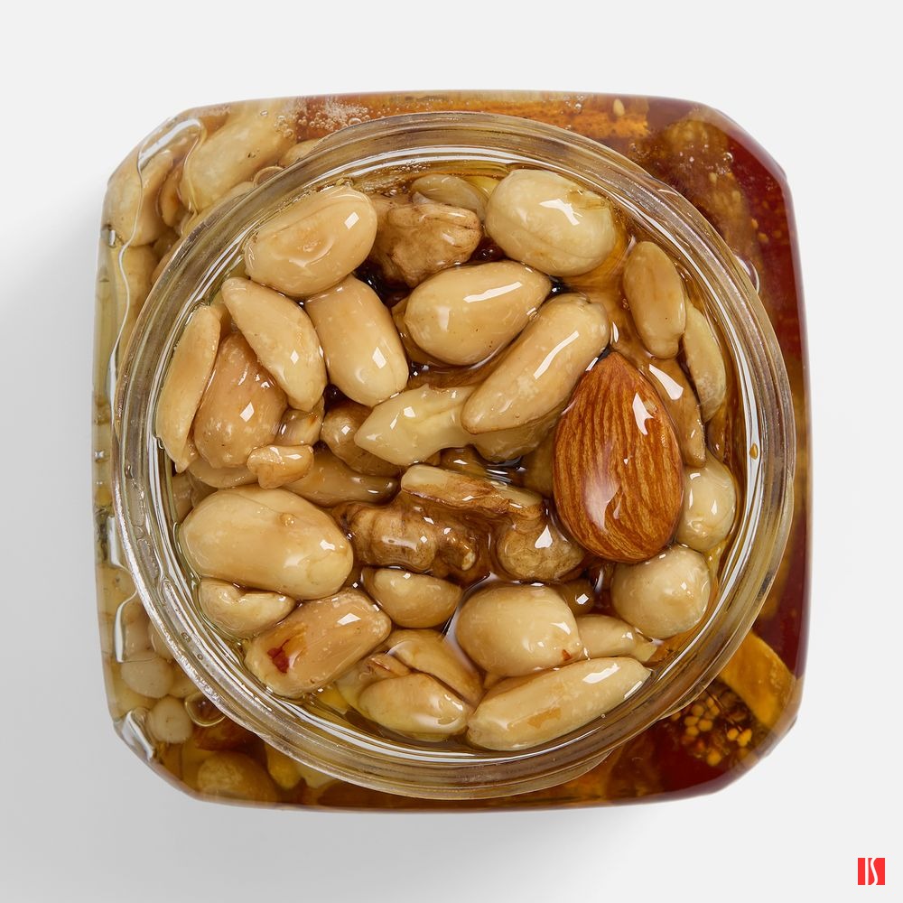 Состав: мед цветочный, арахис жареный, грецкий орех, цукаты клубники, инжир вяленый, миндаль, кедровый орех, фундук, кешью, апельсин сушеный, цукаты ананаса, фруктоза, глюкоза.