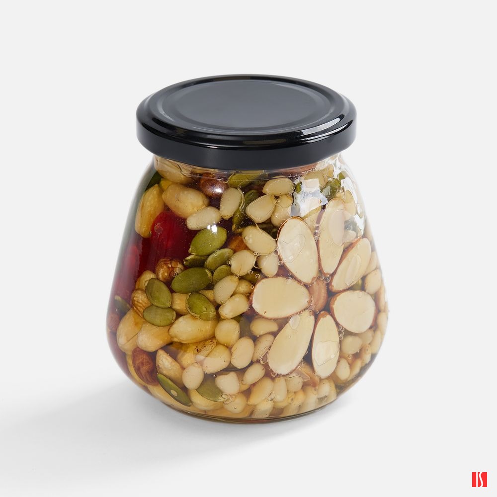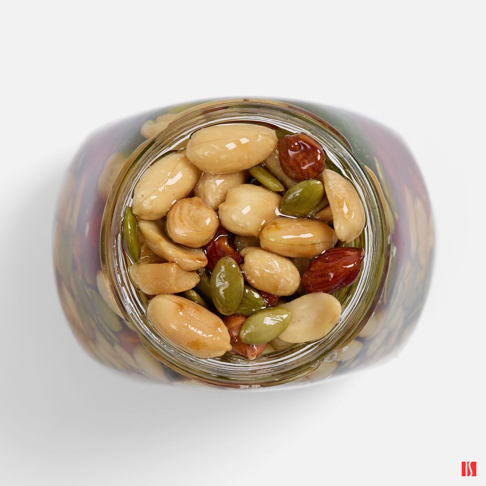 Состав: мед цветочный, арахис жареный, цукаты киви, цукаты вишни, семена тыквы, фундук, кедровый орех, миндаль, фруктоза, глюкоза.