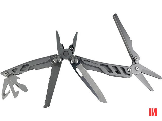 Мультитул компактный, легкий и удобный в использовании. Он будет незаменимым помощником на даче, в поездке, в турпоходе, дома и на работе. Он включает в себя много полезных инструментов: кусачки, плоскогубцы, пилу, острогубцы, стропорез, отвертку Philips, ножницы, нож, открывалку для банок, линейку и стеклобой.