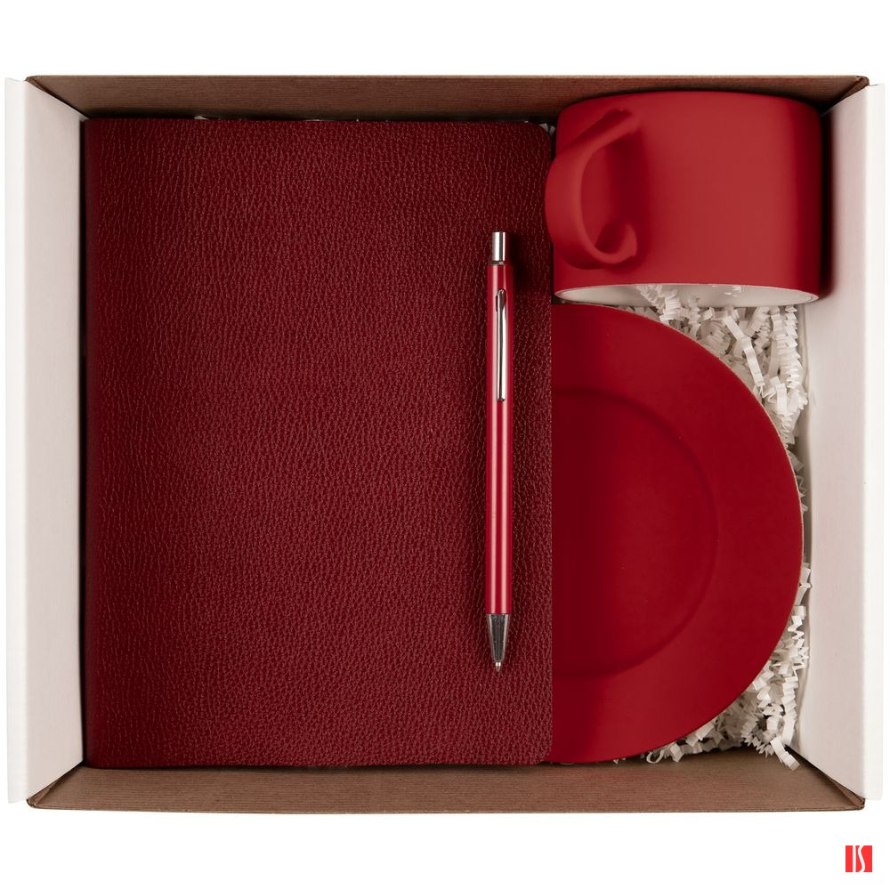 ежедневник - искусственная кожа; чайная пара - фарфор, покрытие соф-тач; ручка - металл; коробка - микрогофрокартон