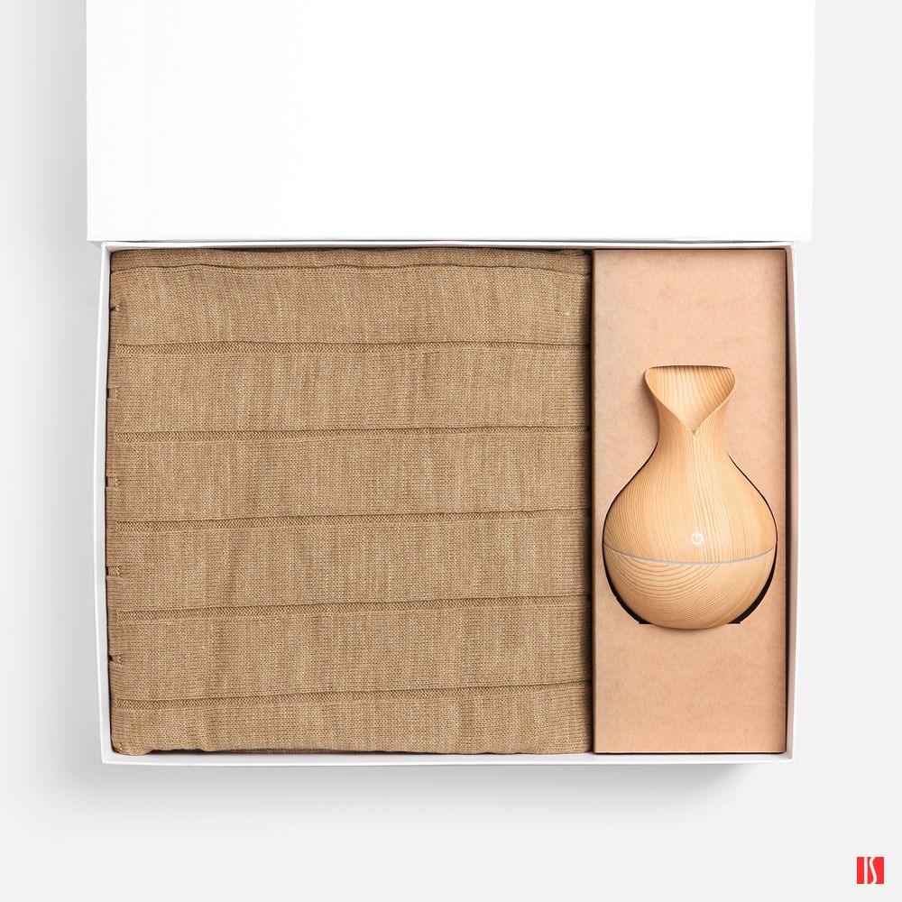 Плед с мягкой текстурой приглашает расслабиться в тепле, а изящный увлажнитель-ароматизатор создает в помещении атмосферу гармонии.