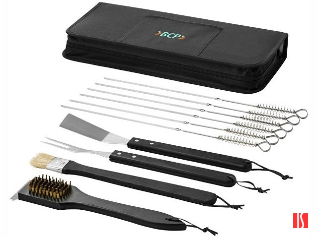 Набор для барбекю "Asado" из 11 предметов. Набор для барбекю включает лопатку для рыбы, кисть, вилку и щетку для очистки с деревянными ручками, шесть шампуров и чехол на молнии с передним карманом для нанесения. Нанесение не предлагается на отдельные элементы набора. Нержавеющая сталь и полиэстер 600D. Заказать с нанесением логотипа от компании «Синтезис».