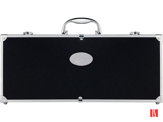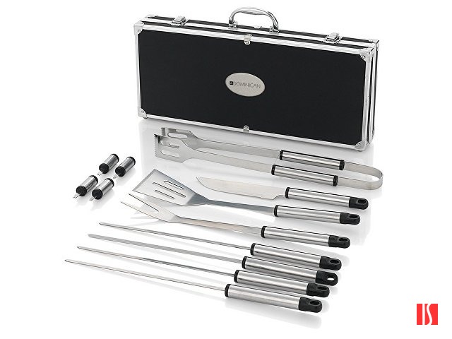Набор для барбекю 12 предметов. 4 шампура, 4 шпажки для снятия шашлыка, нож, щипцы, вилка, лопатка. Шильд в комплекте 4,8 х 8,3 см. Заказать с нанесением логотипа от компании «Синтезис».