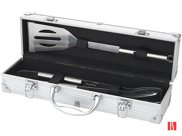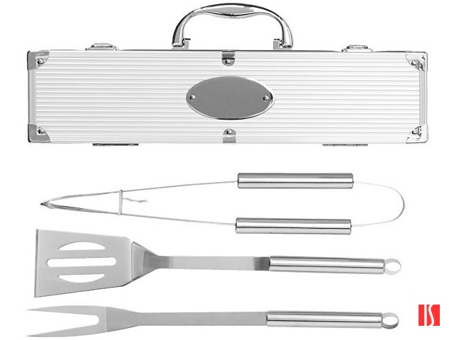 Набор для барбекю 3 предмета. Лопатка, щипцы и вилка в кейсе. На алюминиевом кейсе имеется шильд для персонализации. Заказать с нанесением логотипа от компании «Синтезис».