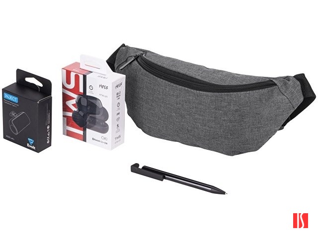 сумка на пояс, ручка шариковая, беспроводные наушники, повербанк