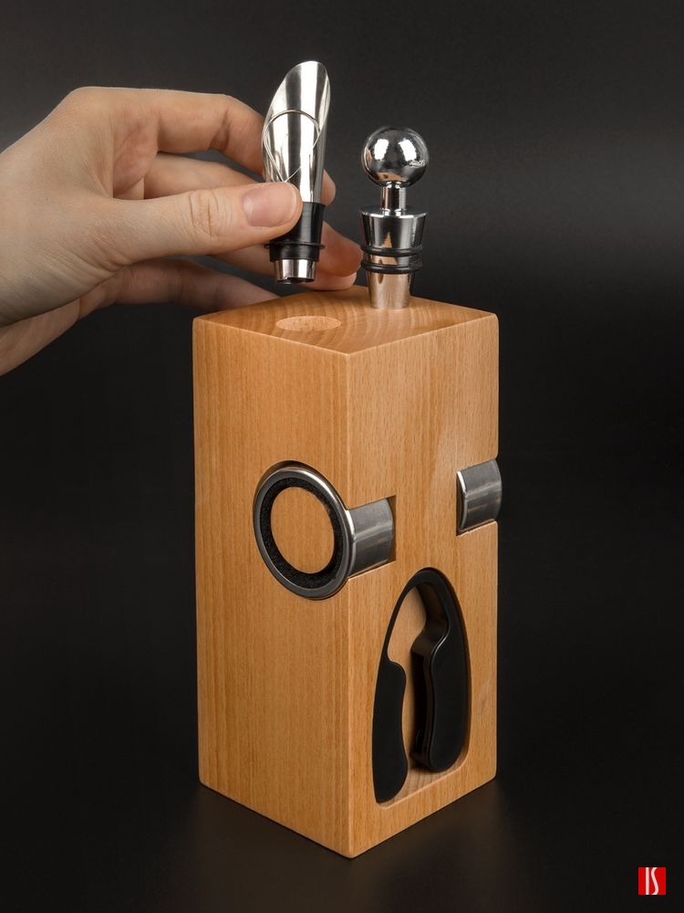 подставка - дерево, бук; штопор - нержавеющая сталь; каплеуловитель - нержавеющая сталь; аэратор - нержавеющая сталь, силикон; пробка - нержавеющая сталь, силикон; нож для фольги - пластик, нержавеющая сталь