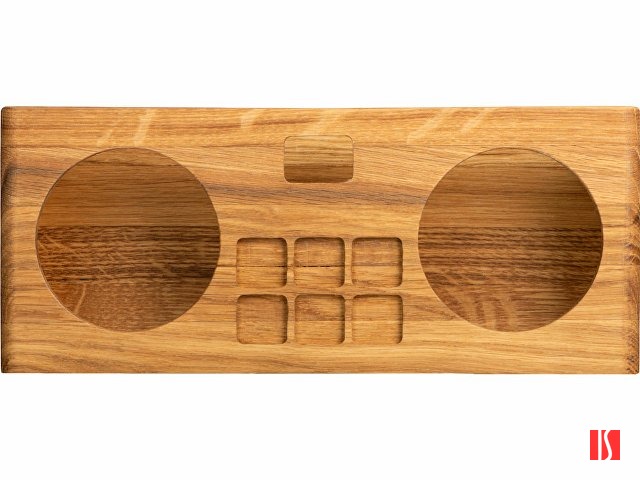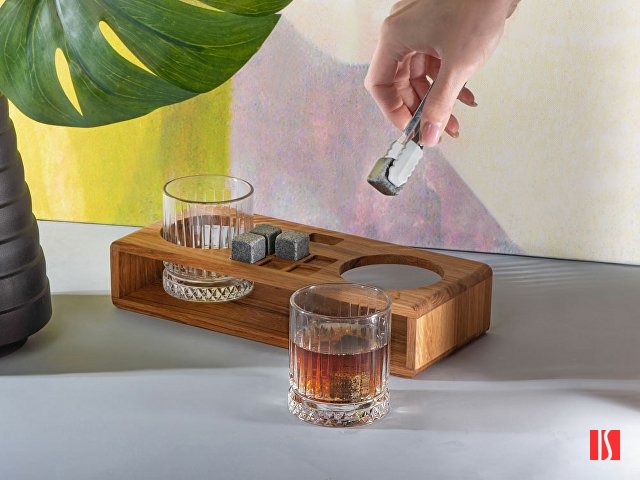 Для сервировки в набор входит дубовая подставка с отверстиями под бокалы и щипцы, а также выемки под кубики.