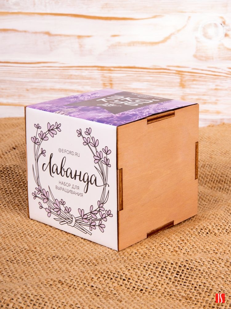 В наборе: деревянный куб, бумажный стаканчик, питательный грунт, семена, вермикулит.
