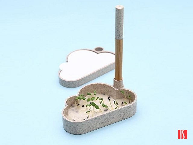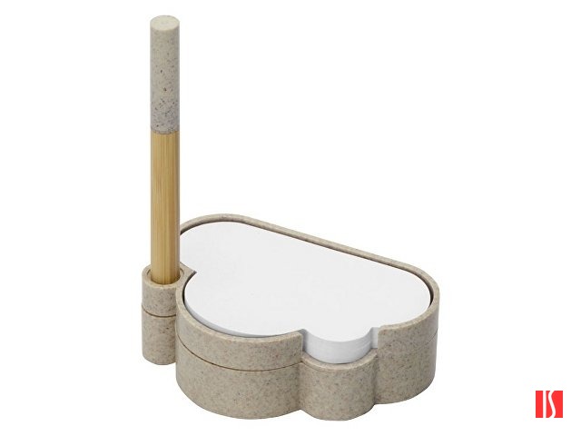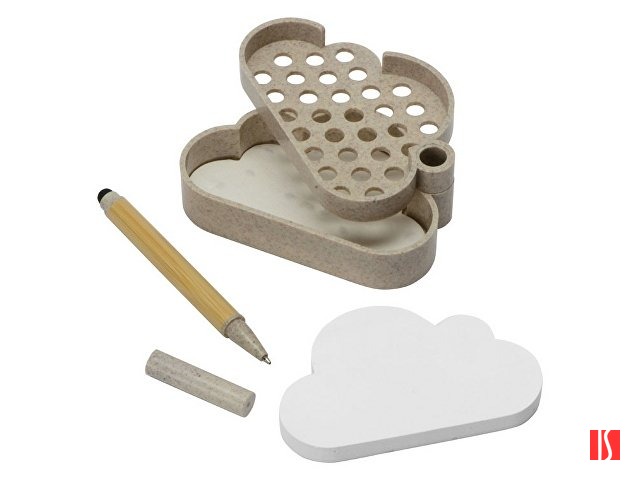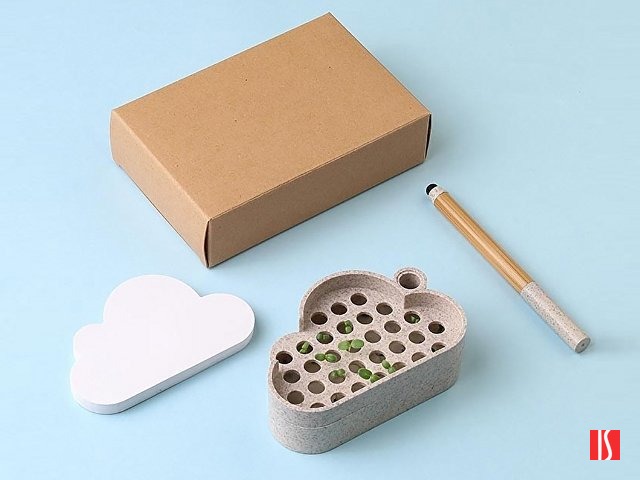 В набор для записей входят удобная подставка в форме облака из переработанной пшеницы, шариковая ручка-стилус из бамбука и переработанной пшеницы, бумага для записей и лист с семенами ромашки. Семена можно посадить как в самой подставке, так и в отдельном горшке. Также в наборе есть инструкция по выращиванию и уходу за ромашкой. Заказать с нанесением логотипа от компании «Синтезис».