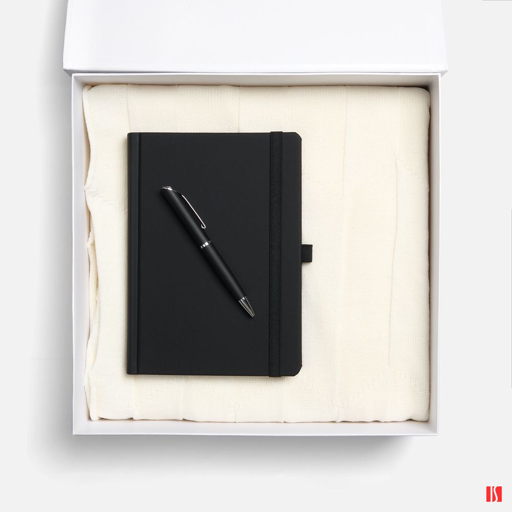 Однотонный набор с основной канцелярией и пледом — классика жанра в уютном исполнении. С компактным ежедневником будет удобно делать заметки в любое время — благодаря петельке для ручки любимый пишущий инструмент будет всегда под рукой. А изысканный акриловый плед с геометрическим узором позволит выразить самые теплые пожелания и ддобавит плавных линий в интерьер. Заказать с нанесением логотипа от компании «Синтезис».