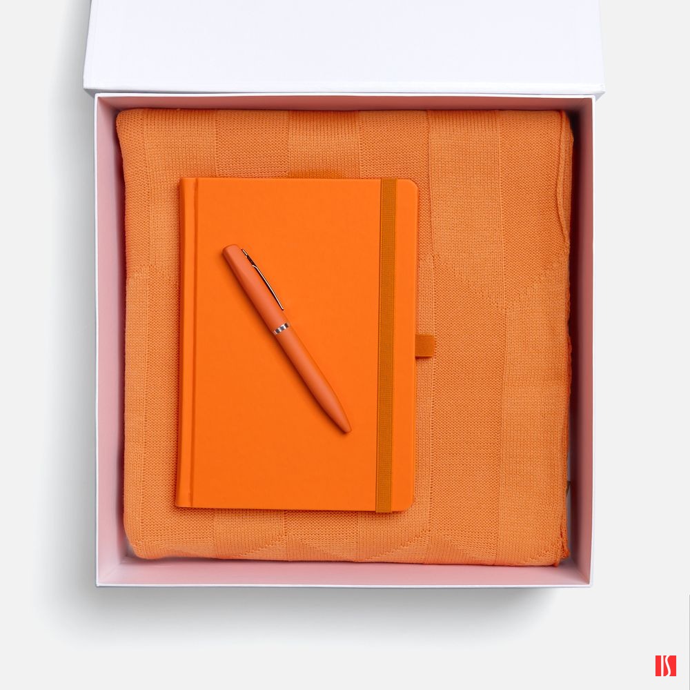 Однотонный набор с основной канцелярией и пледом — классика жанра в уютном исполнении. С компактным ежедневником будет удобно делать заметки в любое время — благодаря петельке для ручки любимый пишущий инструмент будет всегда под рукой. А изысканный акриловый плед с геометрическим узором позволит выразить самые теплые пожелания и ддобавит плавных линий в интерьер. Заказать с нанесением логотипа от компании «Синтезис».