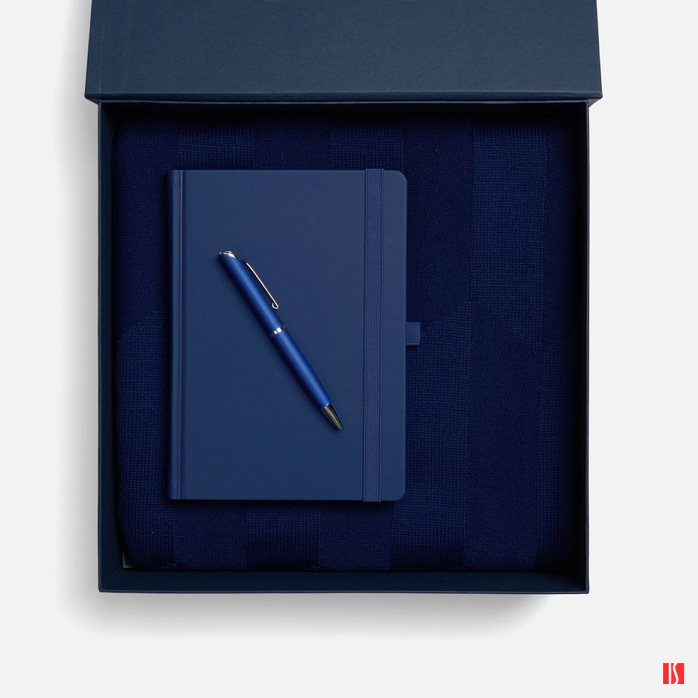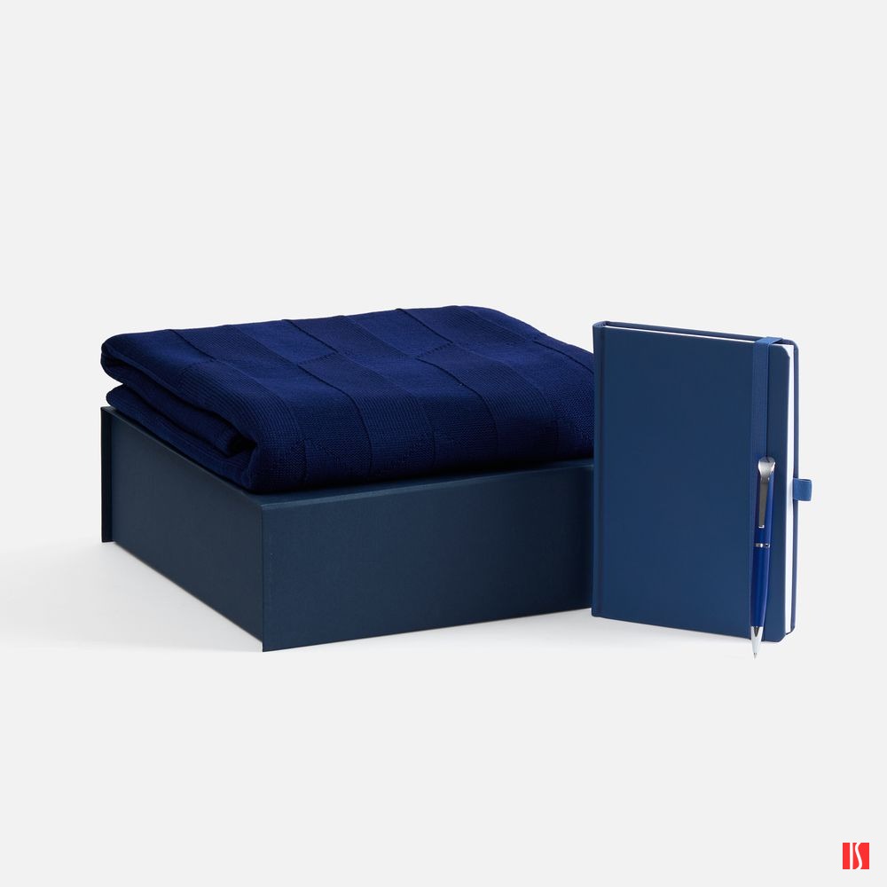 Однотонный набор с основной канцелярией и пледом — классика жанра в уютном исполнении. С компактным ежедневником будет удобно делать заметки в любое время — благодаря петельке для ручки любимый пишущий инструмент будет всегда под рукой. А изысканный акриловый плед с геометрическим узором позволит выразить самые теплые пожелания и ддобавит плавных линий в интерьер. Заказать с нанесением логотипа от компании «Синтезис».