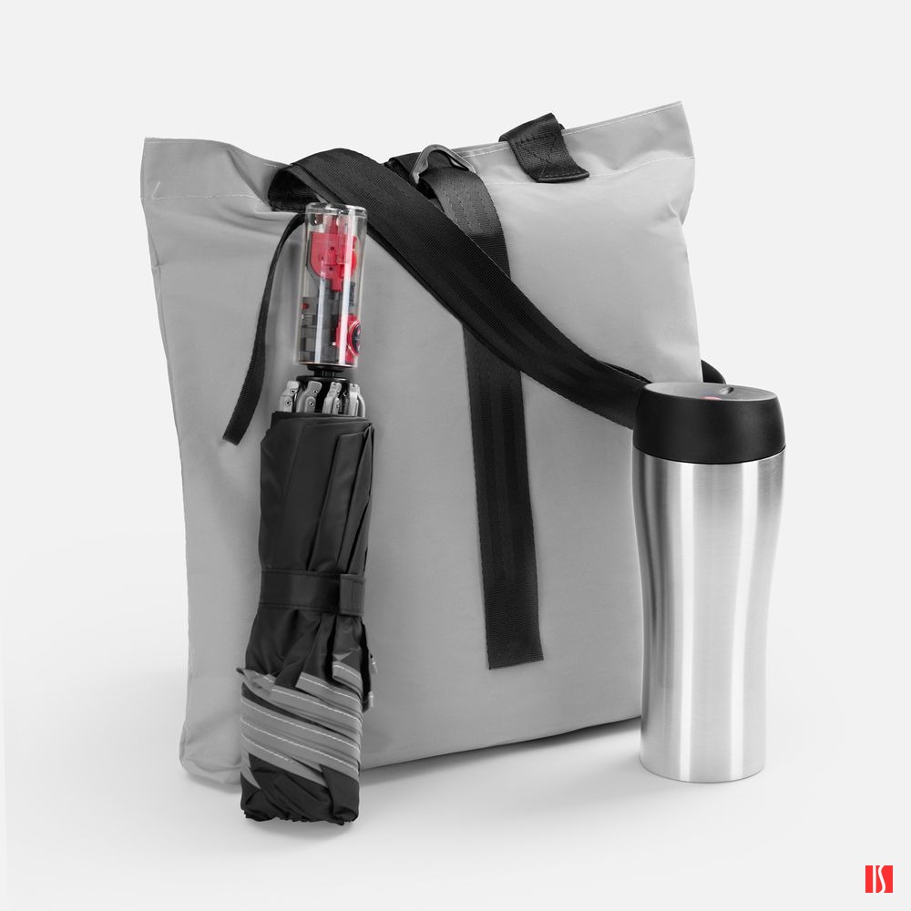 В набор Future Manifest входят необычный складной зонт наоборот и вакуумный термостакан с высокими показателями удержания температуры, упакованные в шопер из светоотражающей ткани, — идеальный аксессуар для комфортных и безопасных прогулок в любое время суток.